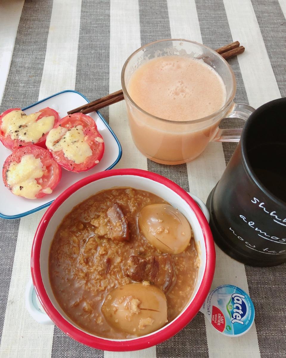 今天在燕麦粥里炖了我妈烧的红烧肉和蛋……