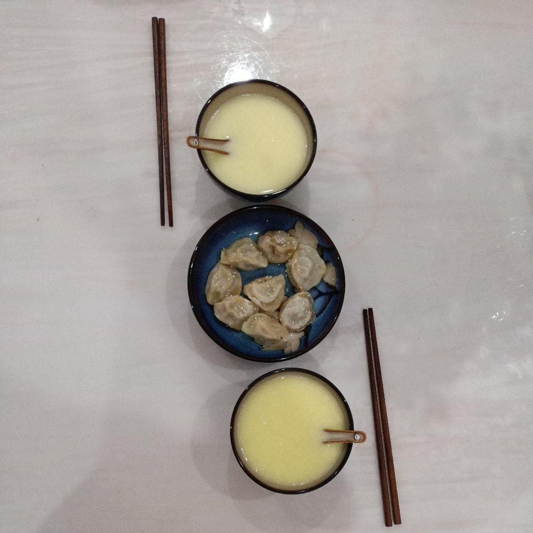 煎饺,拌黄瓜,土豆丝,黑米粥