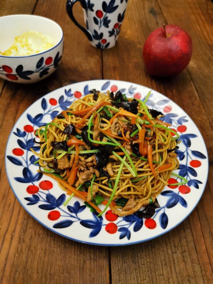🍀 早安!今天吃炒面,放了胡萝卜,黑木耳,香菜,一点肉,不爱吃胡萝卜的孩子也光盘了💁