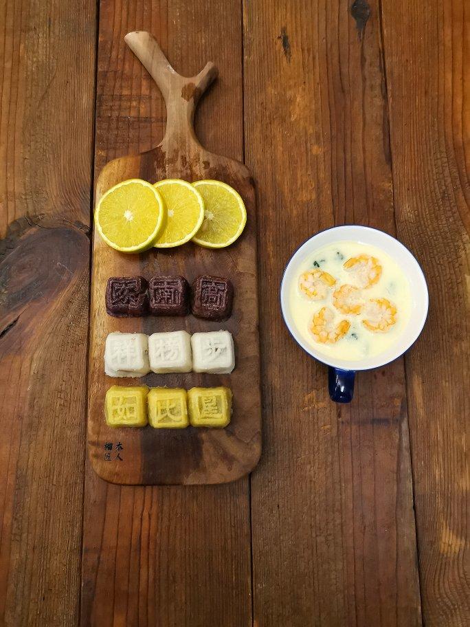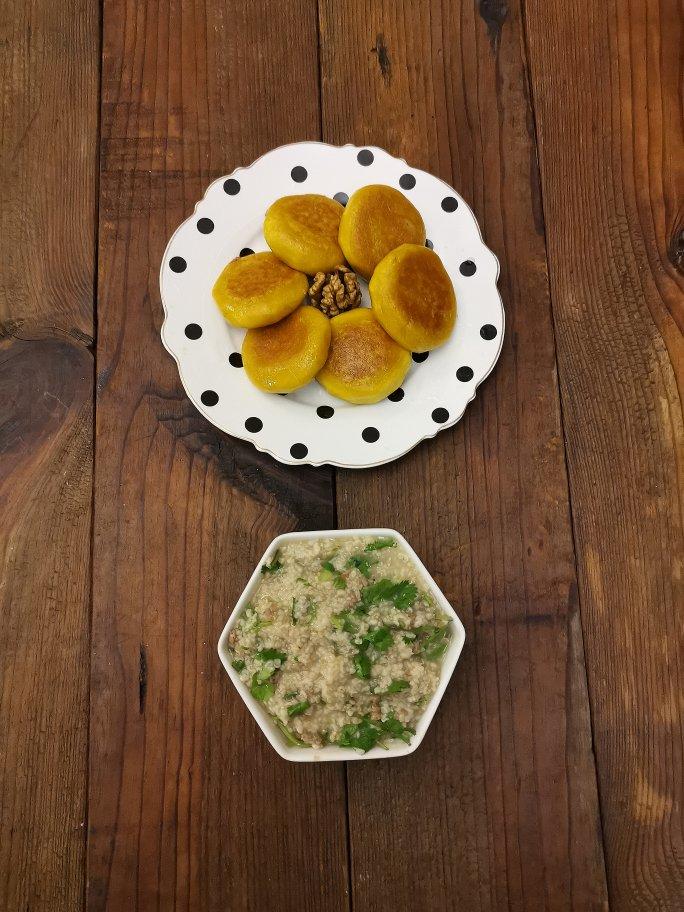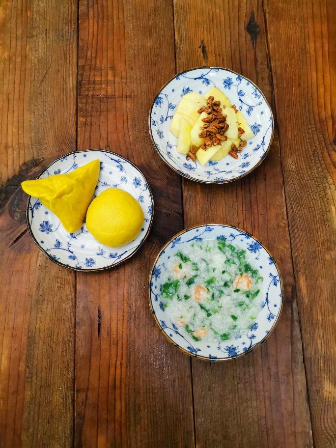 虾仁荠菜粥,南瓜豆沙包
