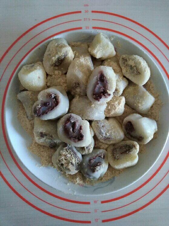 头一天烤黄豆面,炒红豆沙,第二天做了驴打滚!200糯米粉50澄粉,热水和面,蒸熟,再活面...