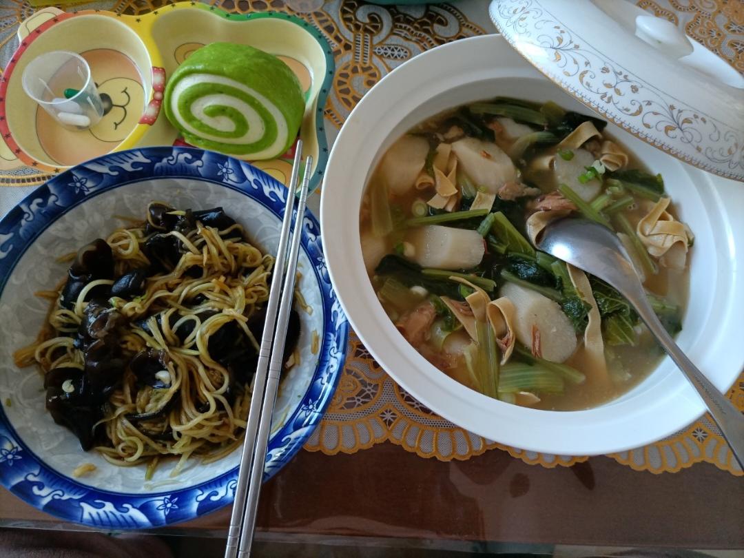 开饭啦!简单的午晚餐,排骨土豆炖豆角,奶香菠菜卷,辣白菜,疫情期间诸多不便,因为抵抗力下降减少了下楼买菜的次数,冰箱囤的...