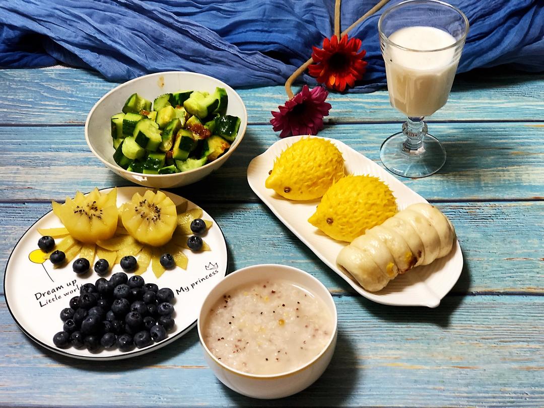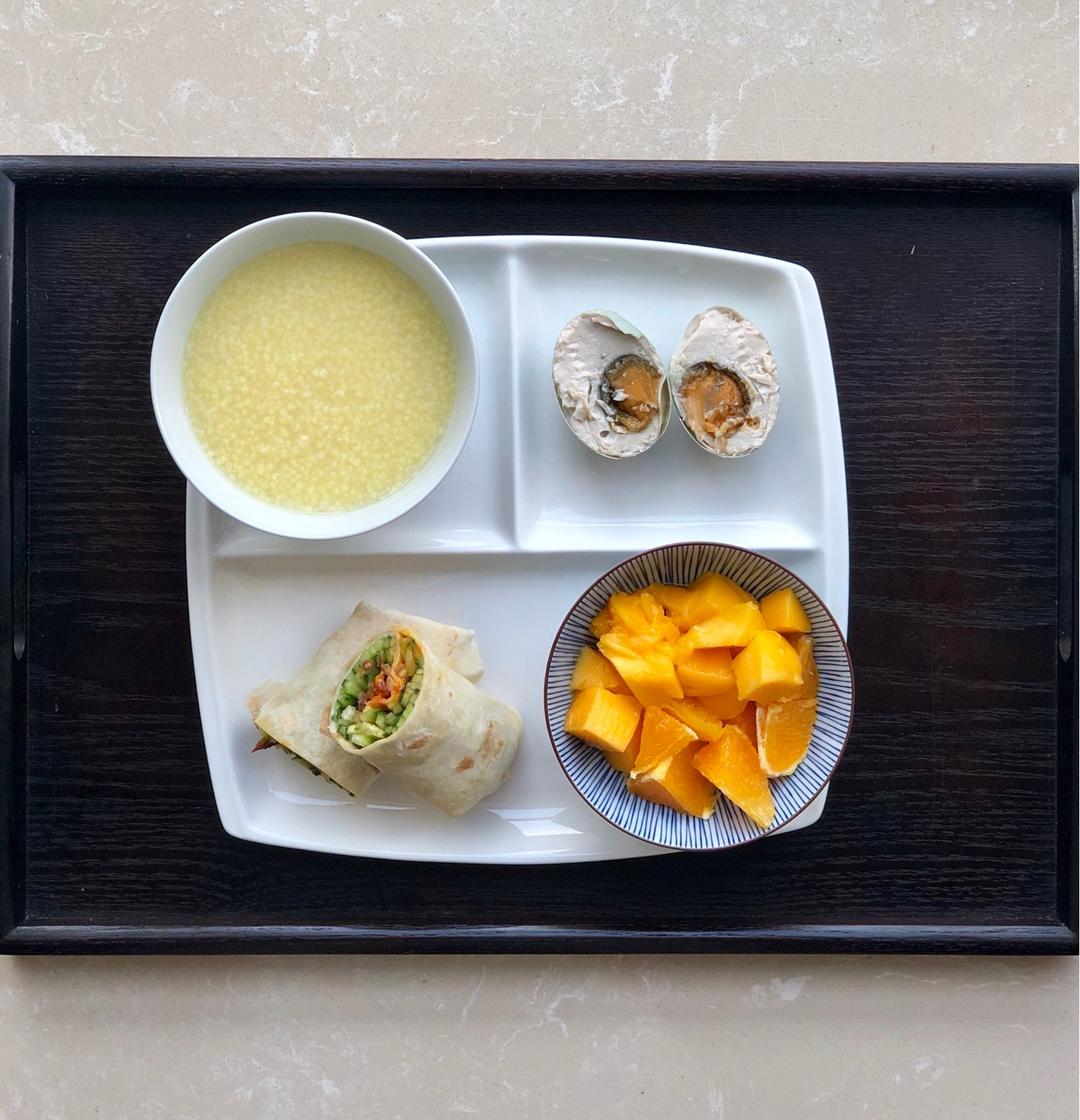 早安:小米粥、培根青瓜卷饼、咸鸭蛋、芒果柳橙双拼