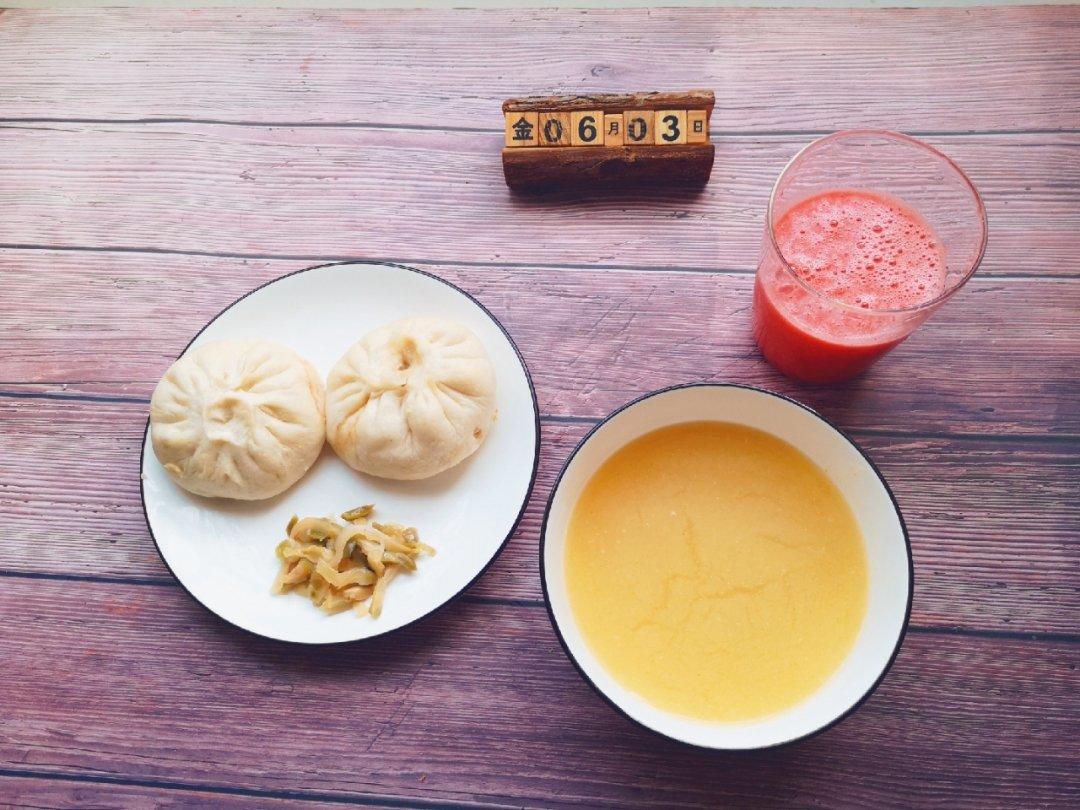 D81:肉包子+玉米面粥+榨菜+西瓜汁 天儿太热了,大家都青睐西瓜汁,...