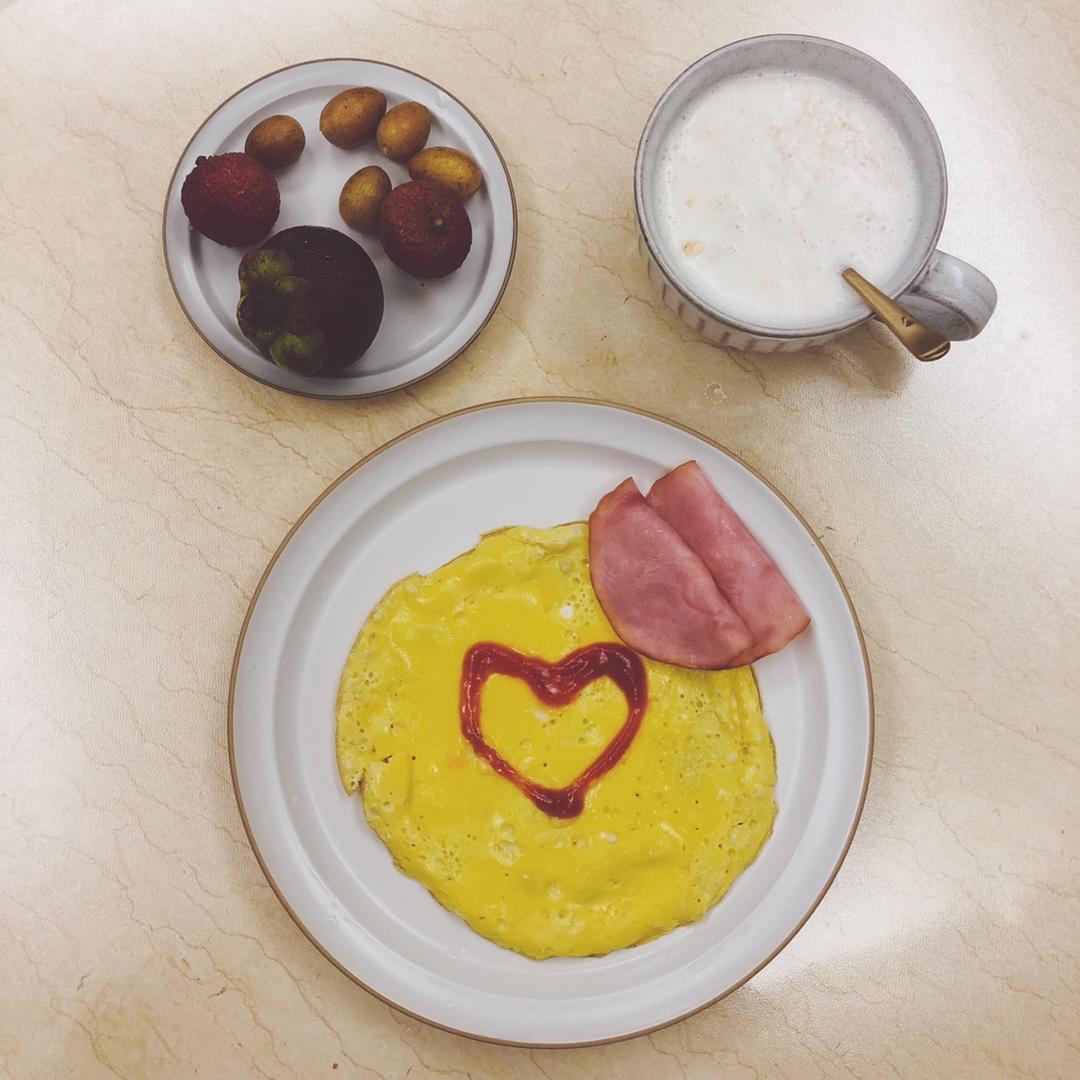 1.5个煎蛋➕番茄酱➕两片火腿➕五个黄皮➕一个山竹➕两个荔枝➕大概50g燕麦?➕牛奶