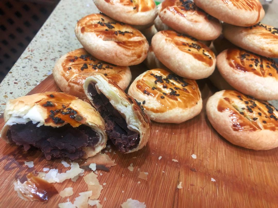 一个好大个,因为是买的红豆沙,所以馅料减到了30g,我会觉得还是有点甜,吃一个就够了。烤箱用的热风模式,30mins。中...