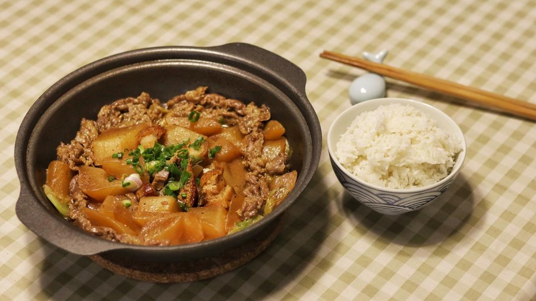 回到家,发现家里只有半根萝卜,半碟肥牛,简单做个萝卜肥牛煲,配一碗白饭,知足。