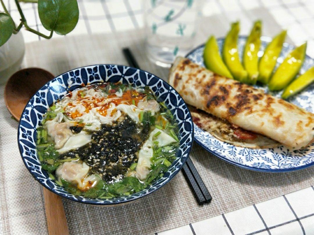 馄饨,肉松手抓饼,甜瓜。