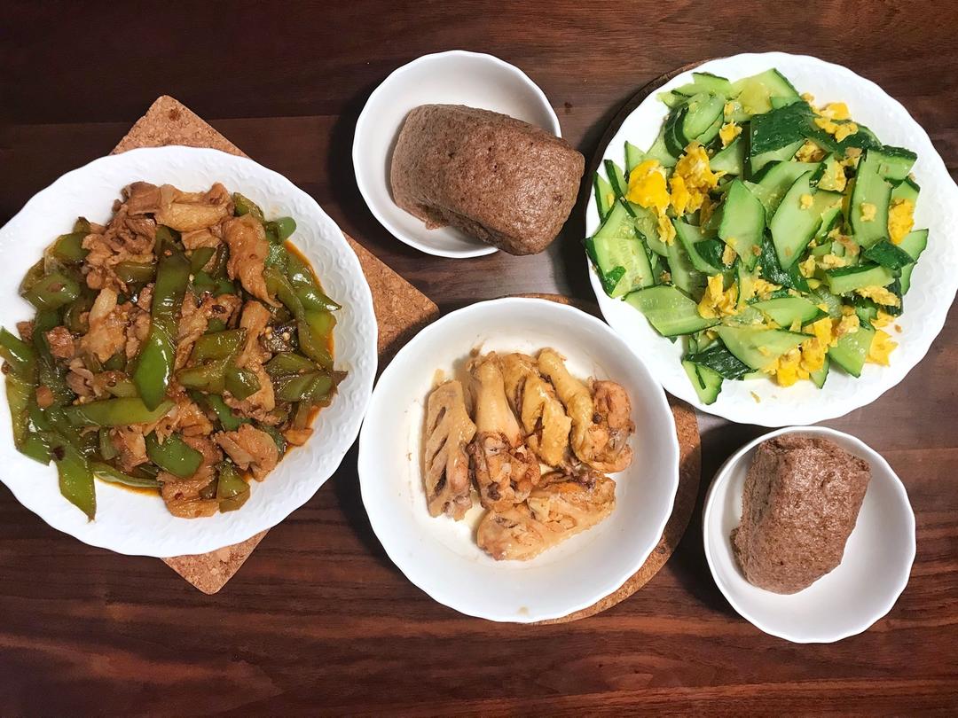小炒肉+鸡翅+黄瓜炒蛋,主食全麦馒头