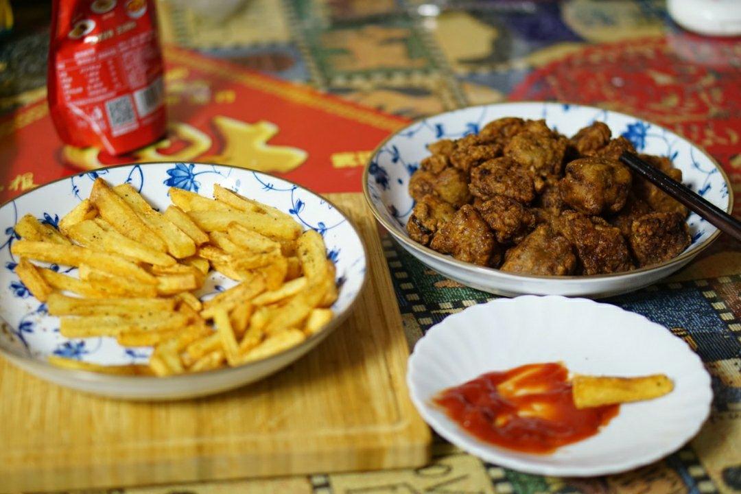 本来满满一盘子薯条,等我炸好排骨端来居然只剩这么点了……😂