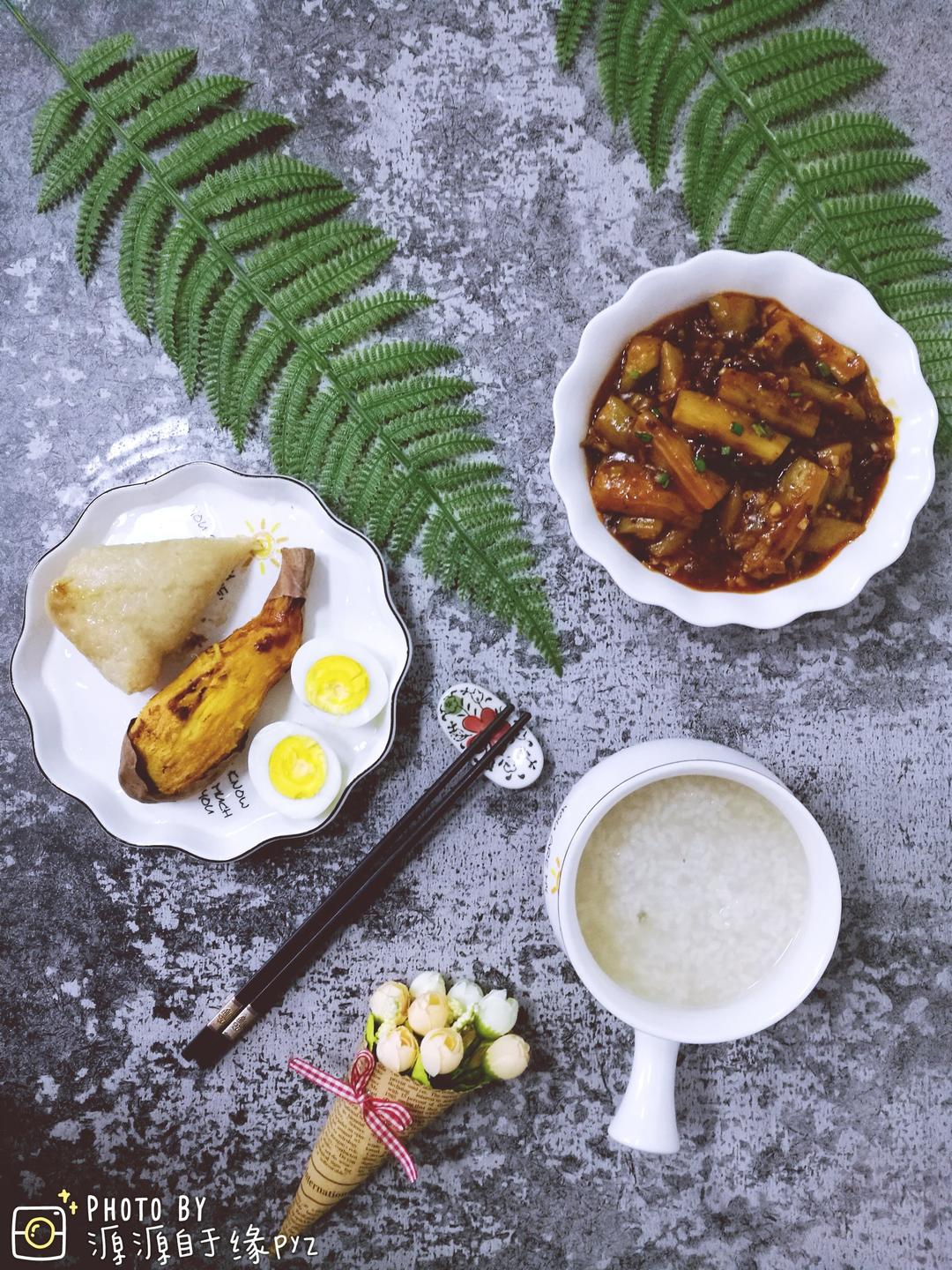 今日小学生早餐:粥,粽子,烤红薯,水煮蛋,肉沫茄子。