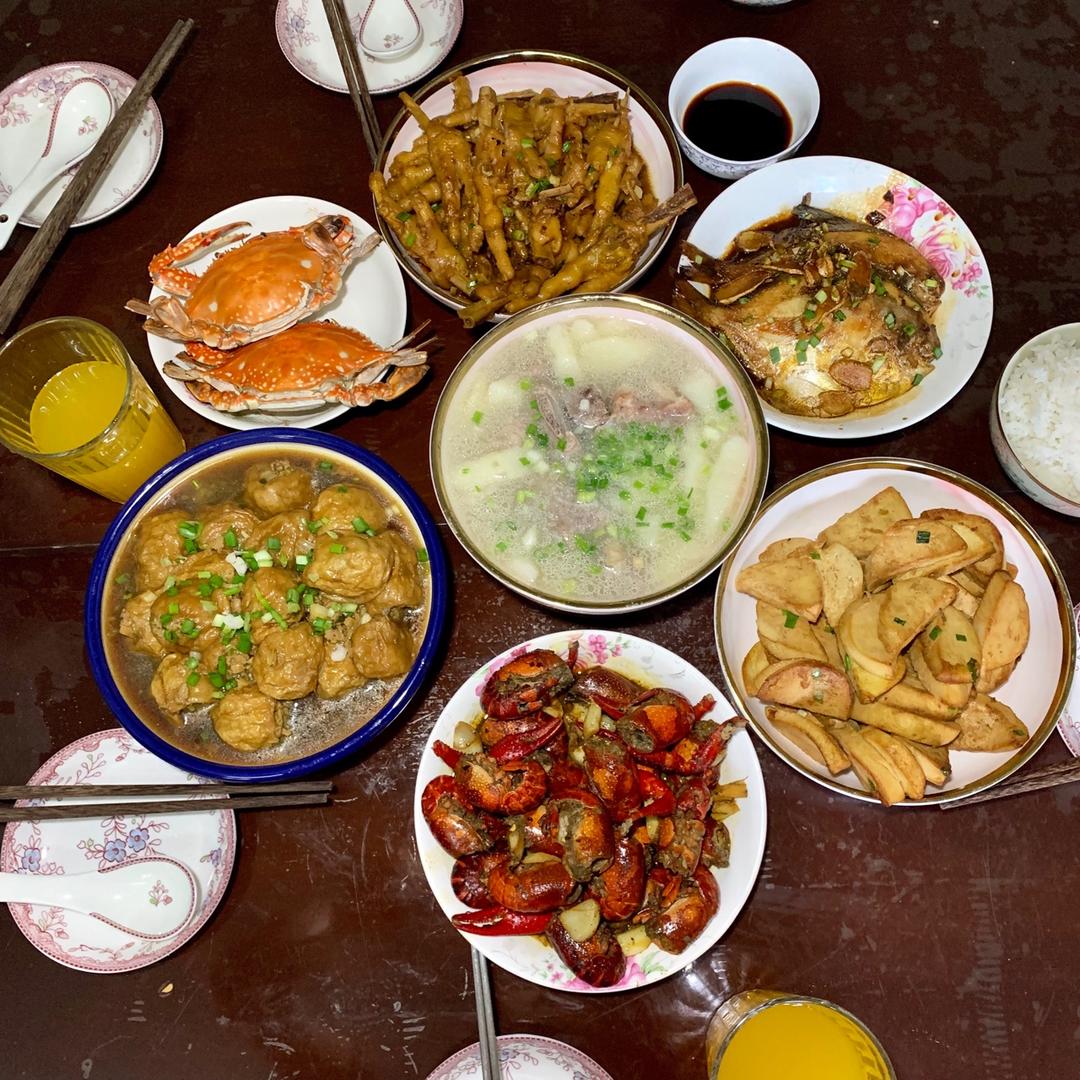 晚餐:油面筋酿肉➕红烧鸡爪➕昌扁🐟➕素鸡➕龙虾➕山药排骨汤➕🦀️