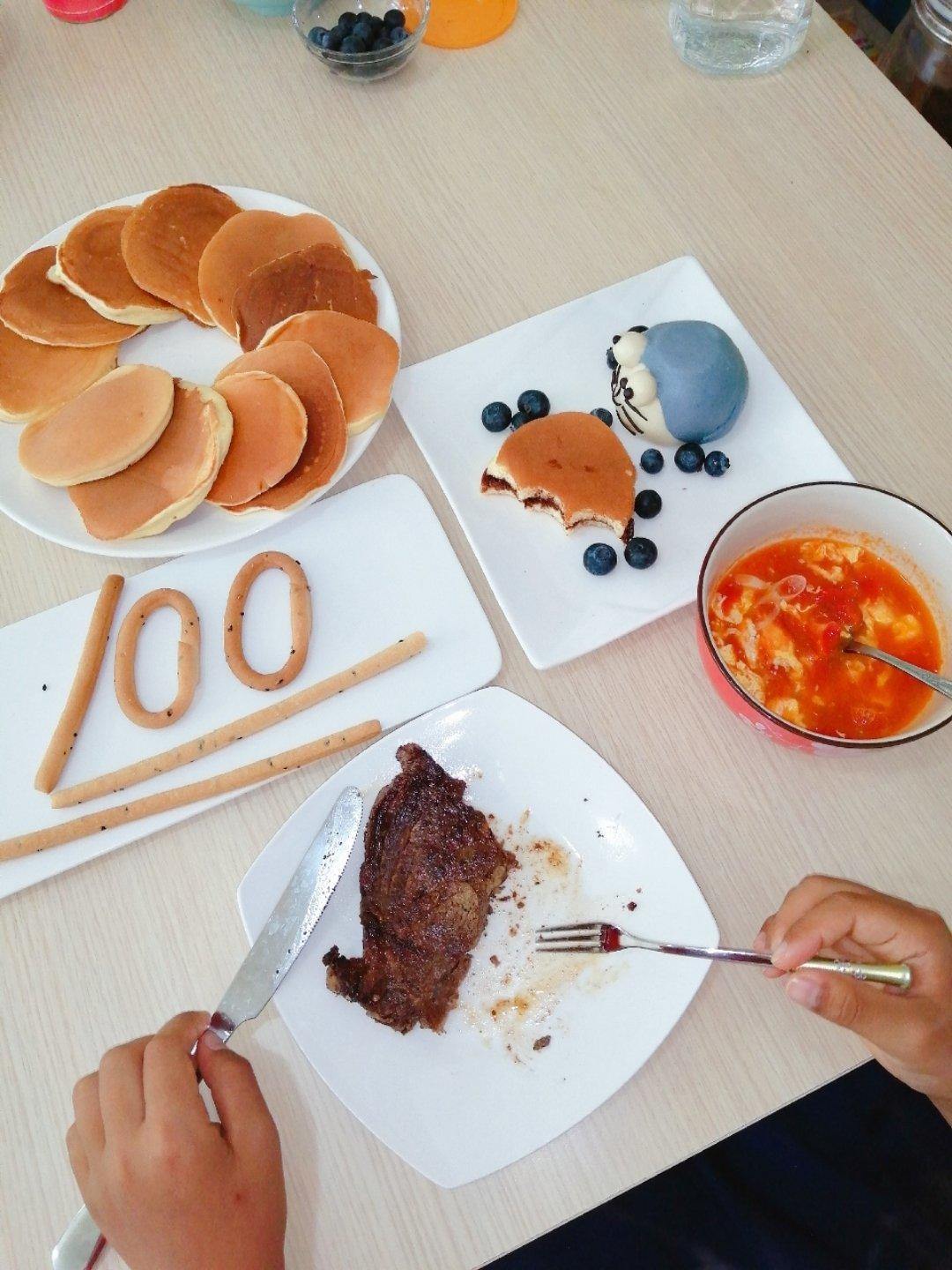 今天辰辰期末考试早餐~铜锣烧,煎牛排,西红柿蛋汤,枣泥夹馅多啦A梦