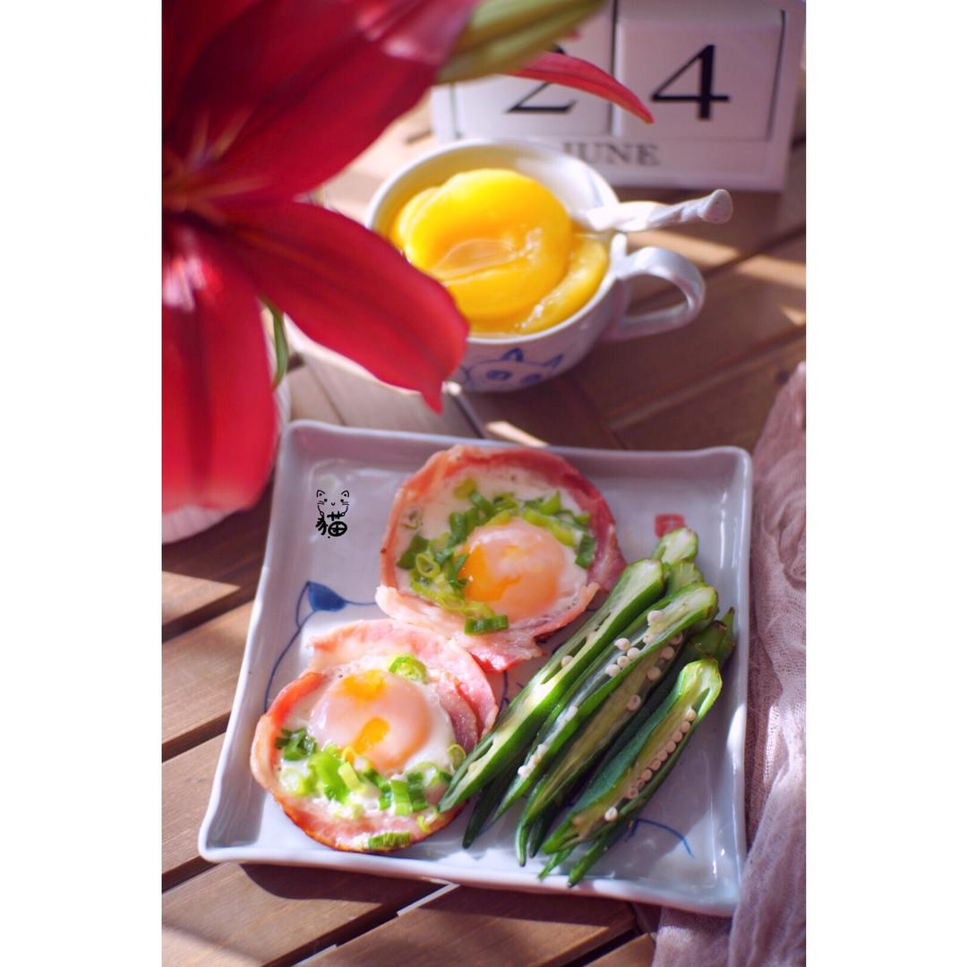 补发早餐打卡,鱼老师的培根煎蛋,煎秋葵,黄桃糖水👩🏻🍳👩🏻🍳👩🏻🍳