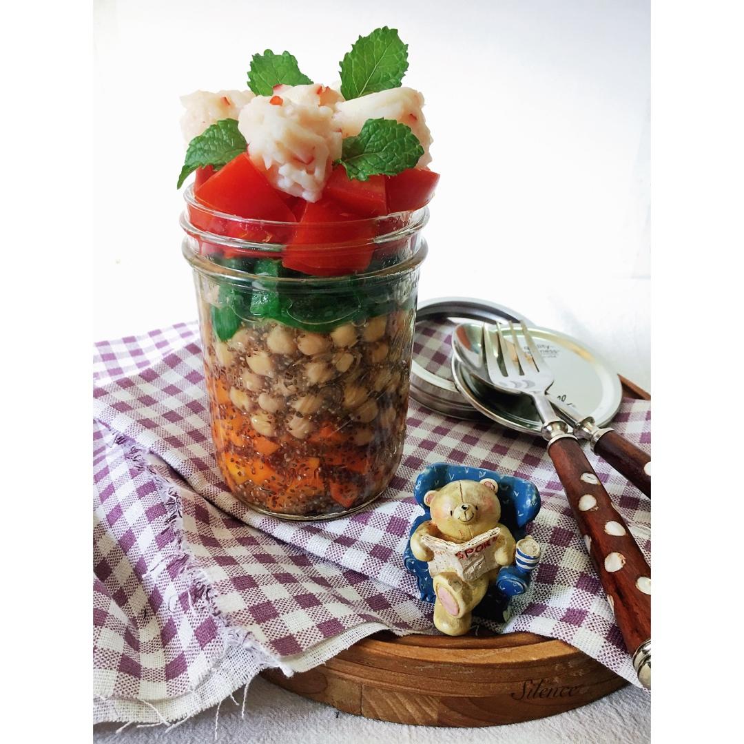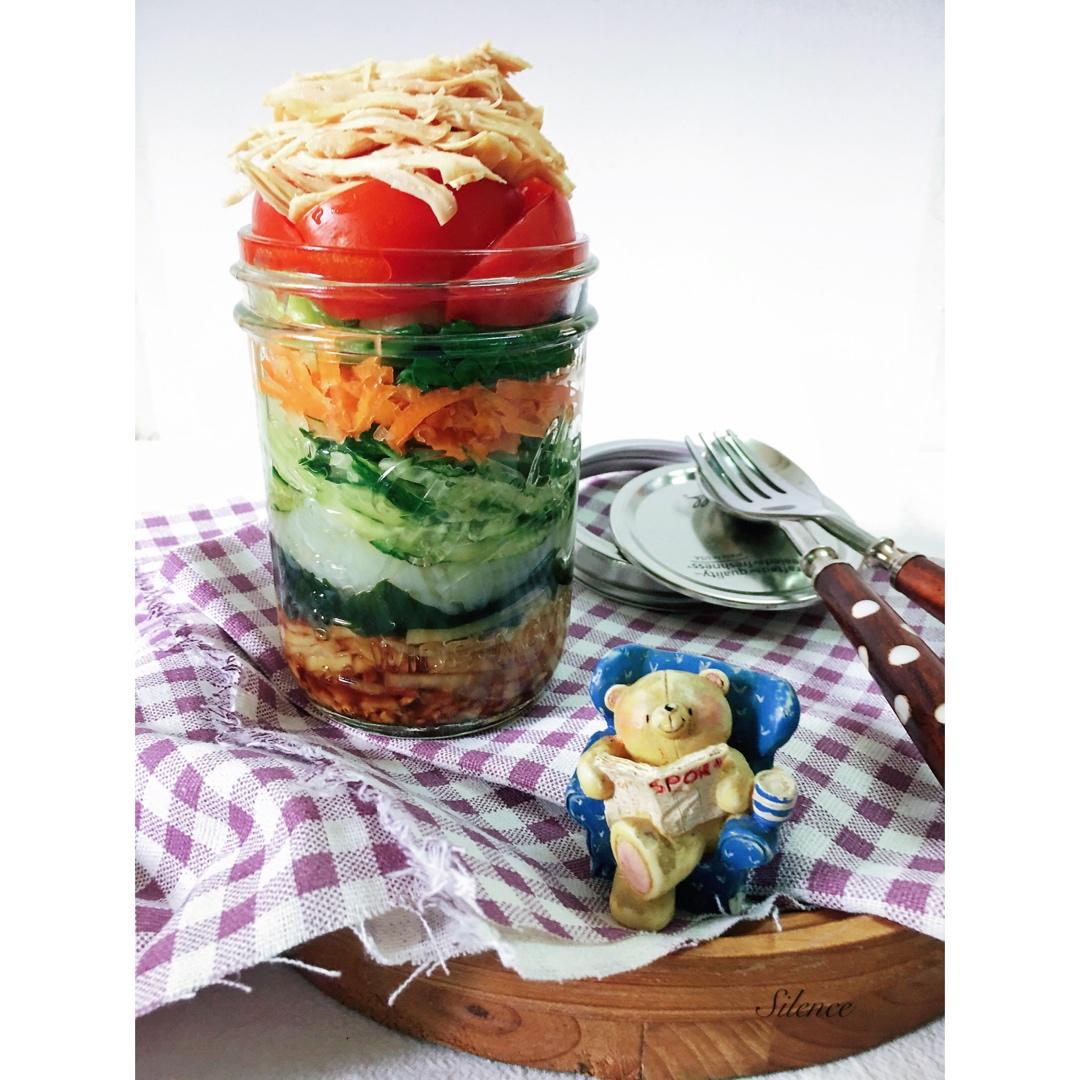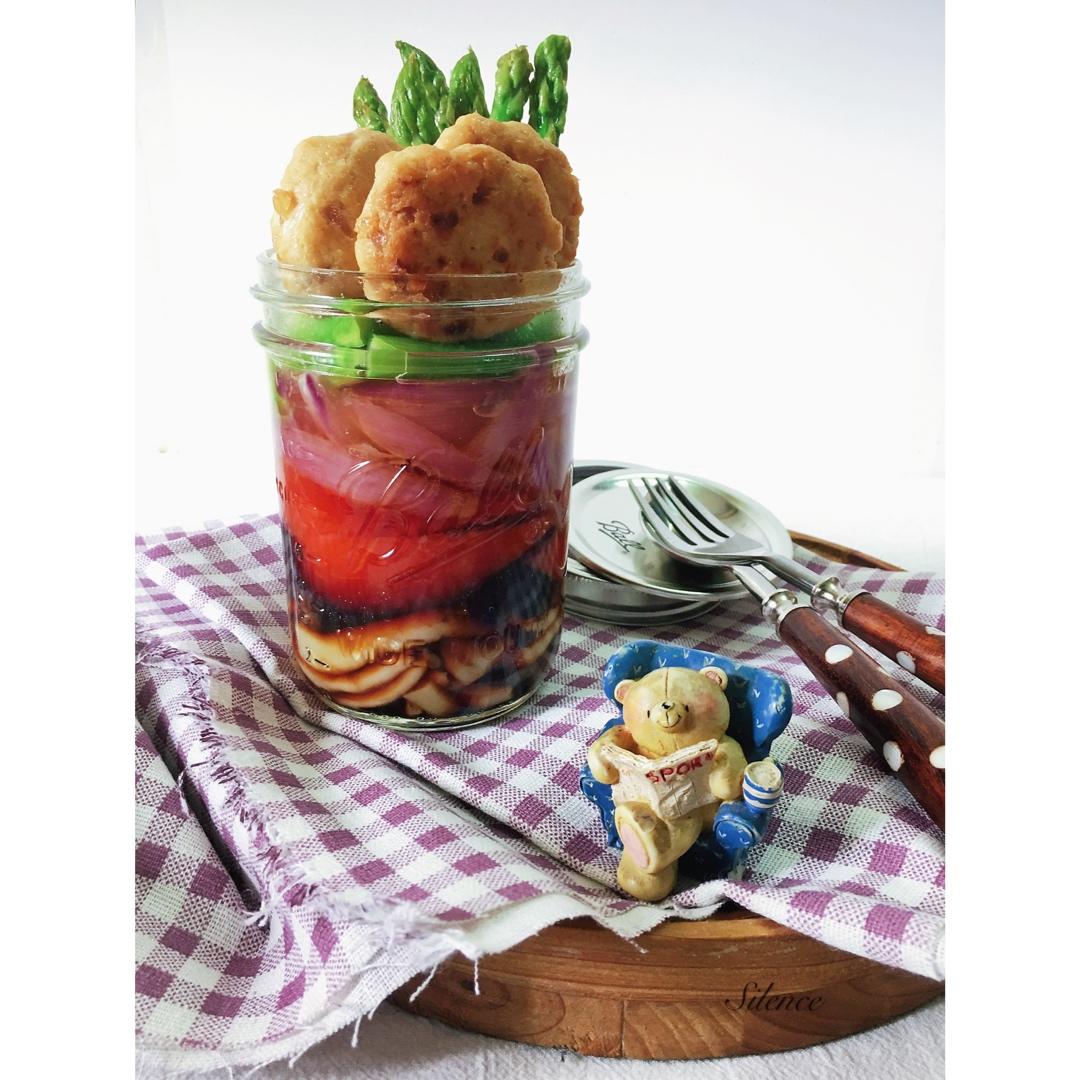 蟹味菇+西红柿🍅+紫洋葱🧅+芦笋+鸡胸肉丸子,搭配的是醋酱汁,默早餐,20200617周三,阳光明媚。#一个人的小食光~...