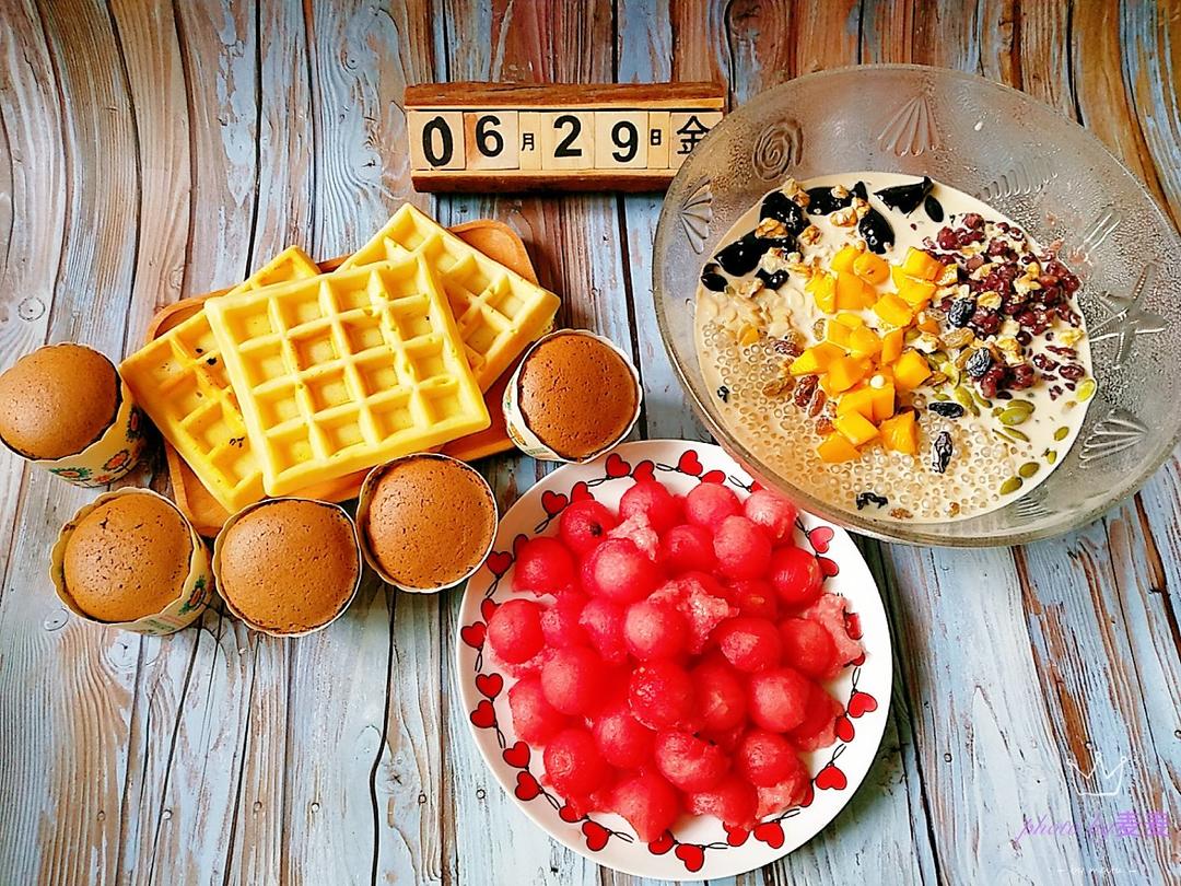 天气好热好热☀☀☀早餐喝点奶茶西米仙草蜜红豆坚果露,华夫饼和巧克力小蛋糕,孩子们的最爱。