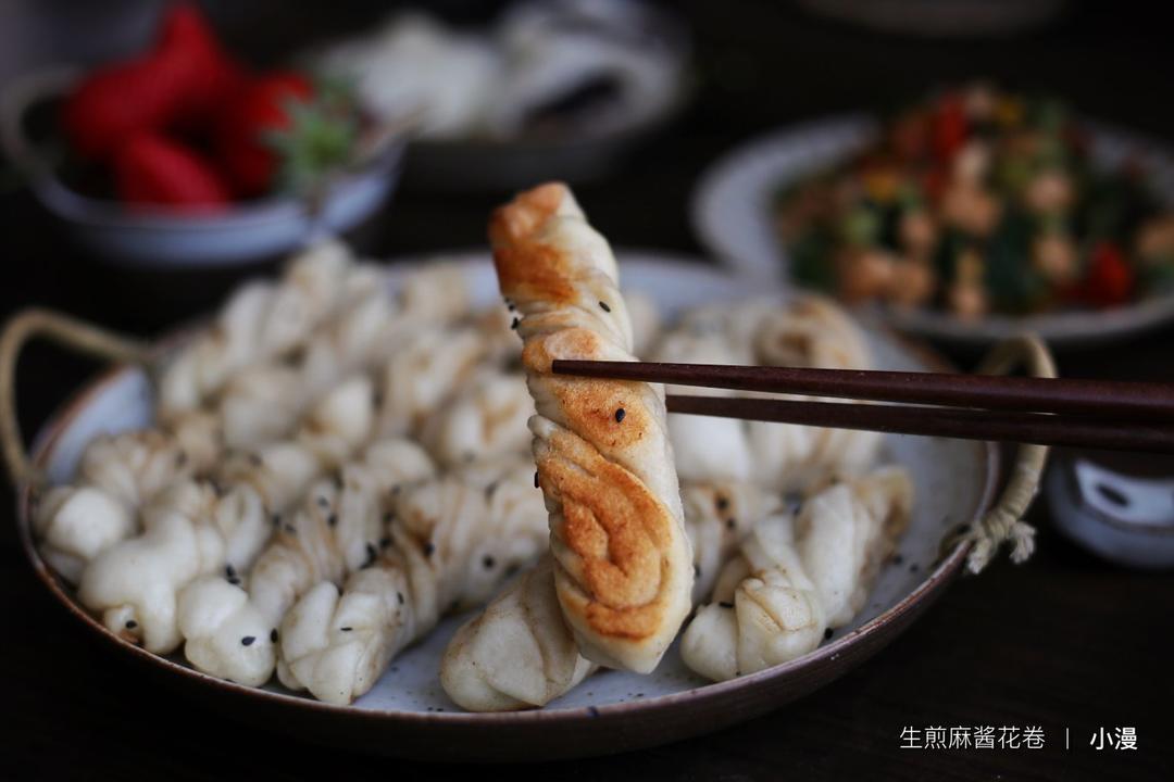 第430天早餐:生煎麻酱花卷+红豆小蒸包+时蔬鸡丁+枸杞小米粥+草莓麦片奶