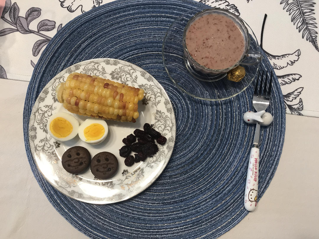 今日~红提养乐多打汁+黑芝麻丸+玉米半根+煮鸡蛋一个+整蔓越莓+巧克力饼干