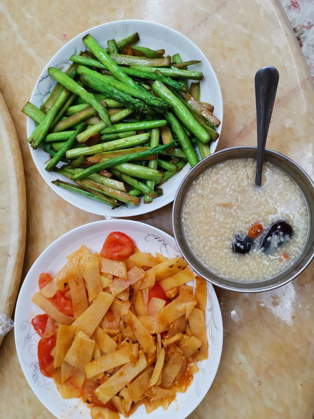 早安,红豆红枣粥蒸南瓜红薯,煎香肠,泡菜煎饺,水果是葡萄和小苹果。