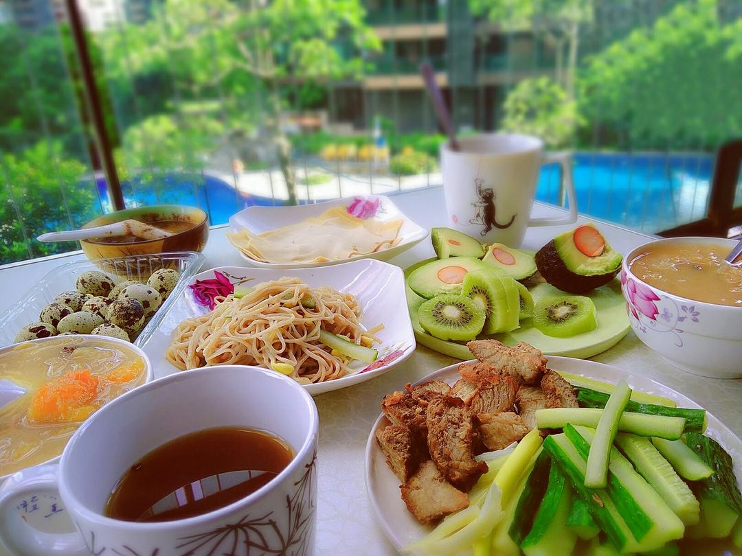 今日假期早餐——姜枣茶、鴳鹑蛋、京酱牛扒、凉拌葱蒜面、木瓜银耳羹、水...