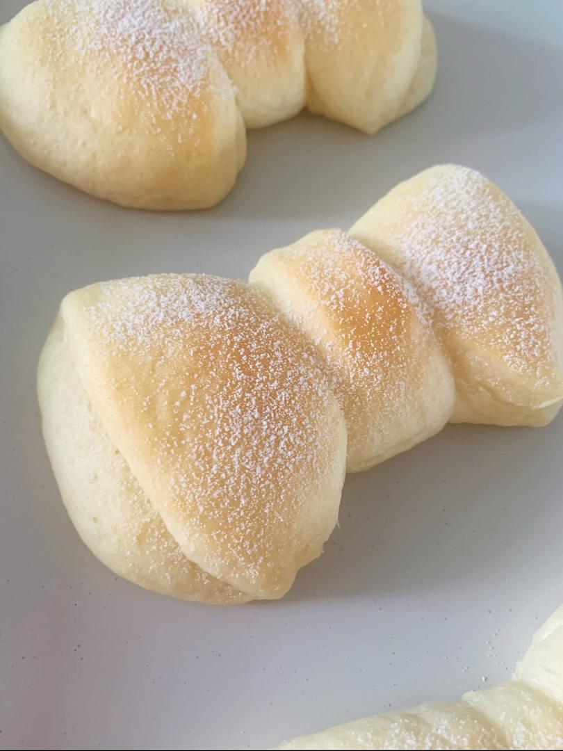 七月烤箱美食日记2⃣️整形超简单的蝴蝶结餐包。松弛好的面团用手拍扁,用刮刀如图2那样切三刀,面团对折,...
