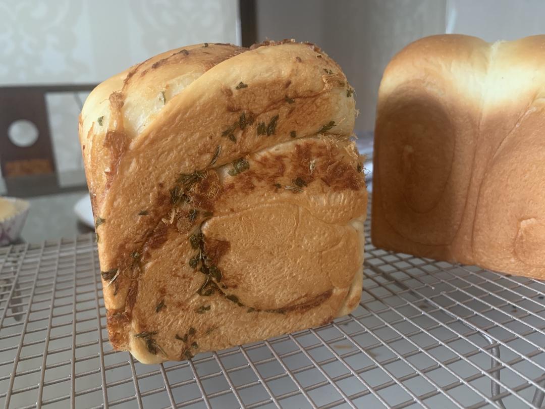 六月烤箱美食日记7⃣️:香葱肉松吐司。现在习惯一个面团弄两种口味,这次是白吐司和肉松吐司。面还是没打好...