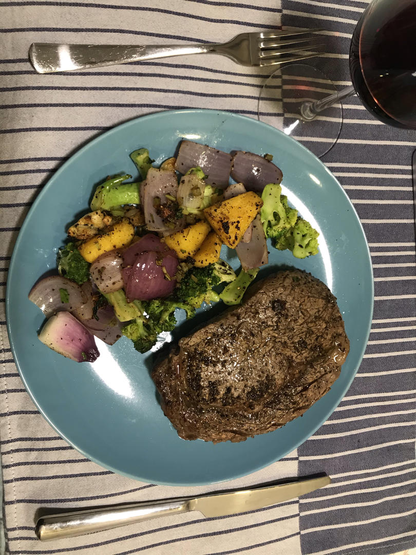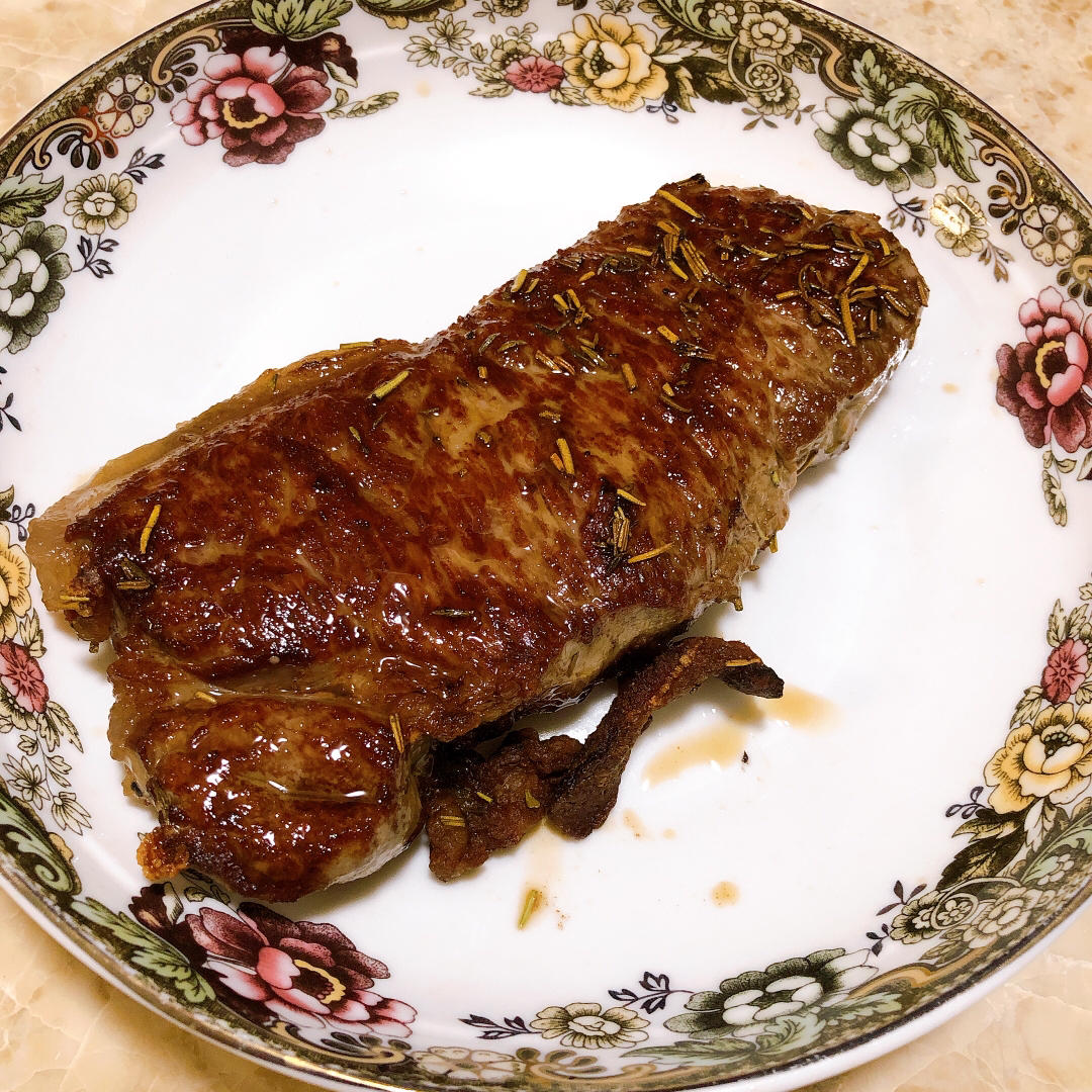 为了煎牛排专门看了半天视频。食用油煎,快结束时再放黄油,迷迭香大蒜,然后用锅里的汁淋在牛...