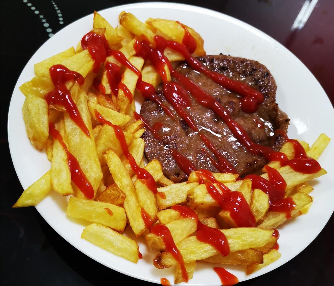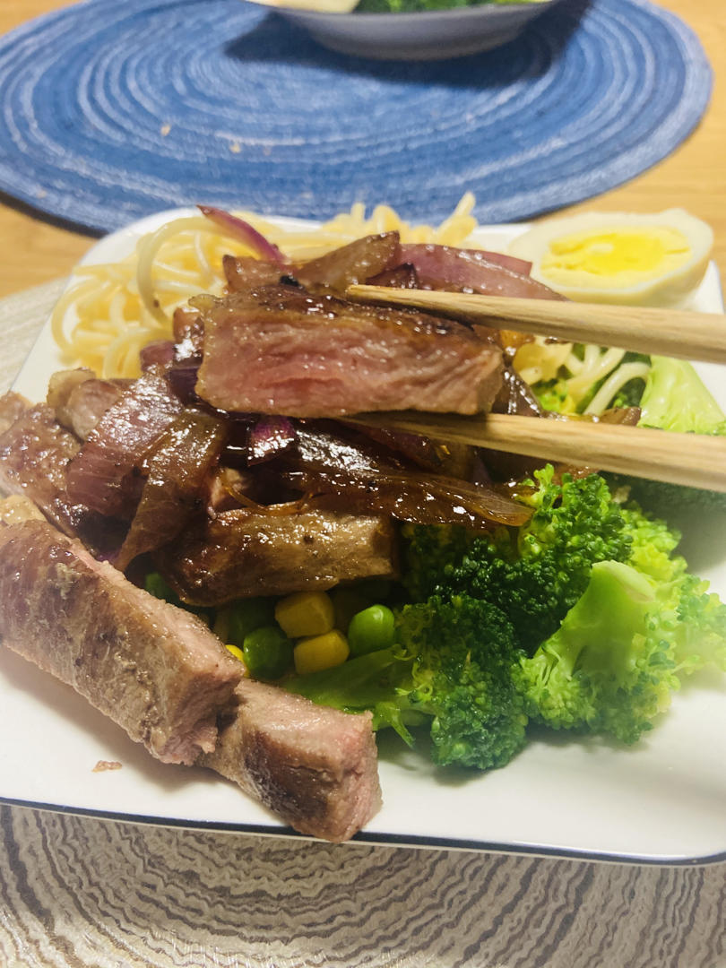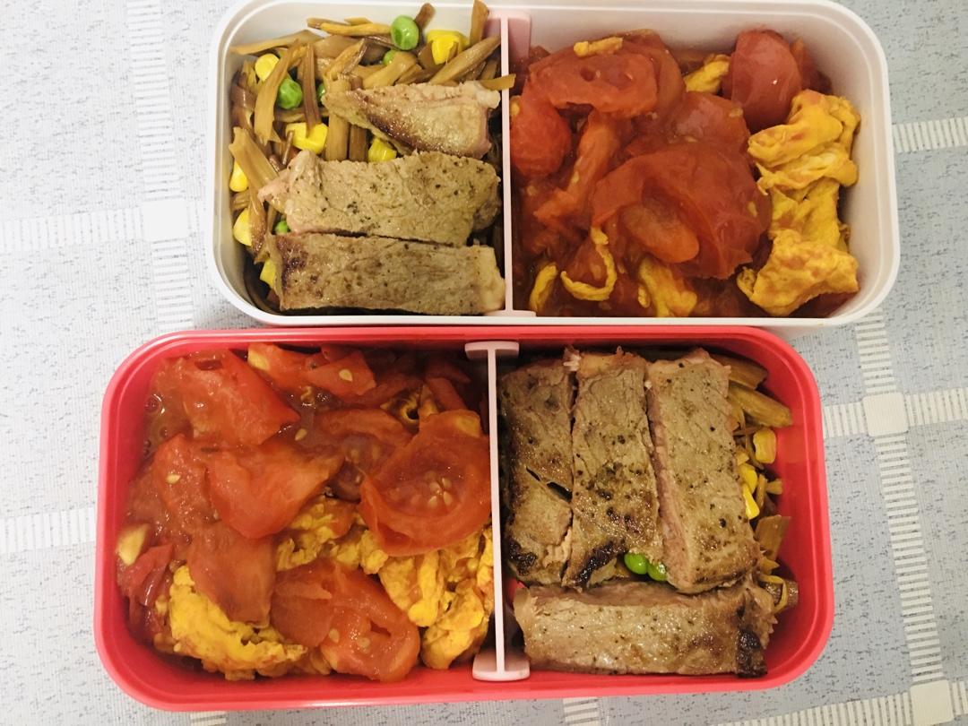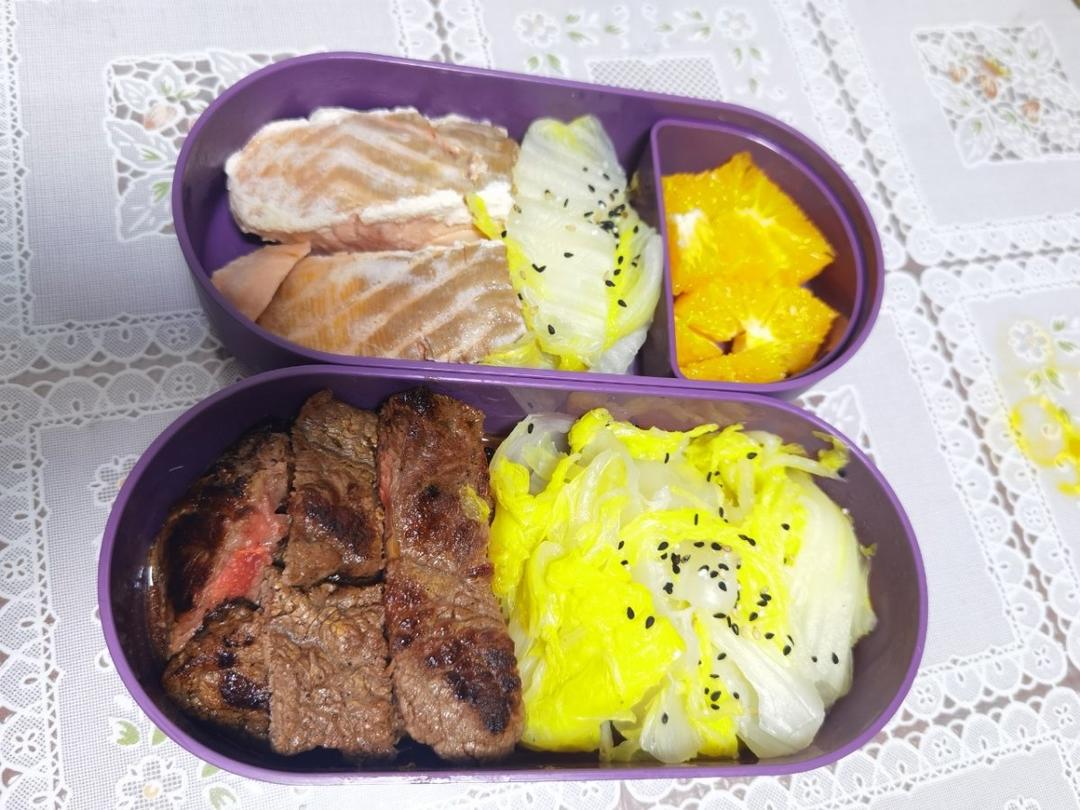 今天晚上别的油腻了,又抢到半价牛排,趁新鲜,晚上11点从床上爬起来做了明天的中饭~