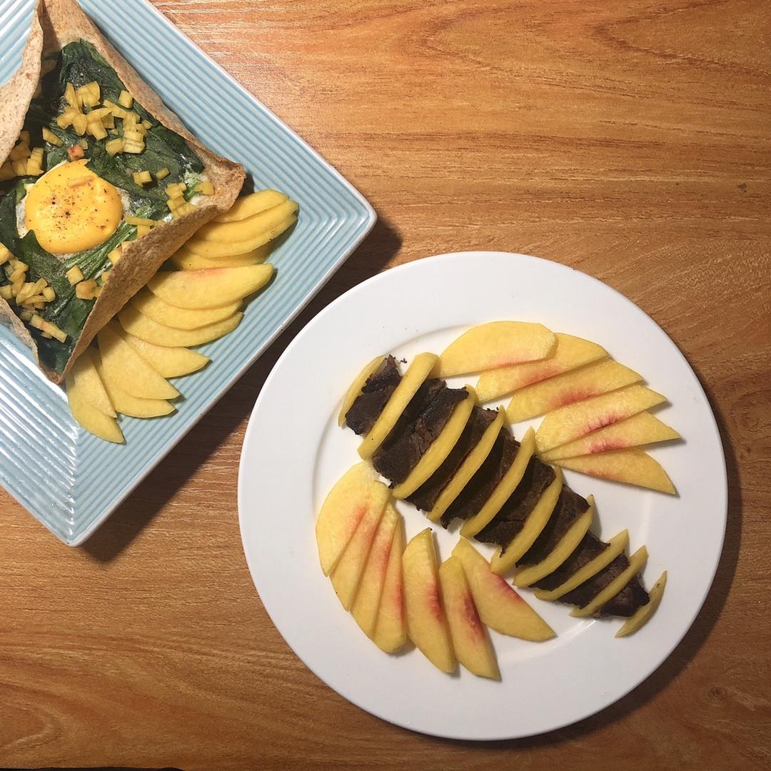 今天是小蜜蜂,把牛油果换成了麻阳黄桃,抱蛋饼也煎得比上次好一些,好...