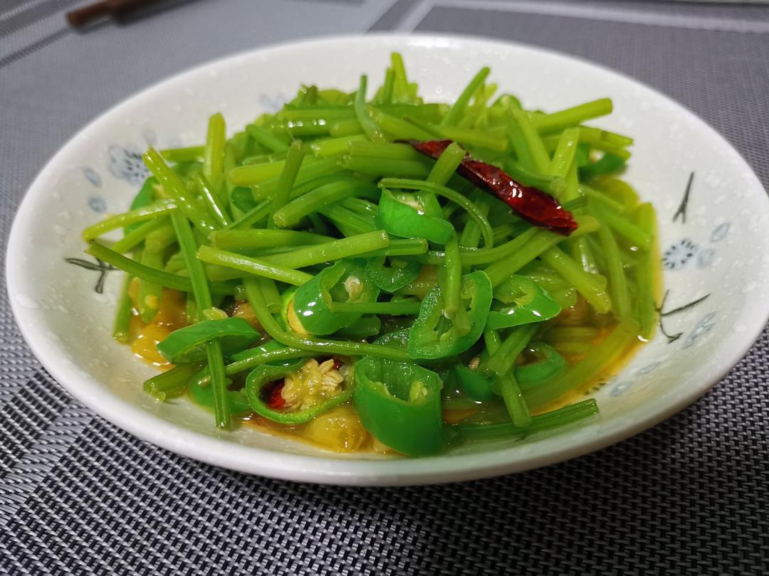 蕃薯藤,自己掐了一把,泡椒青椒炒一下。