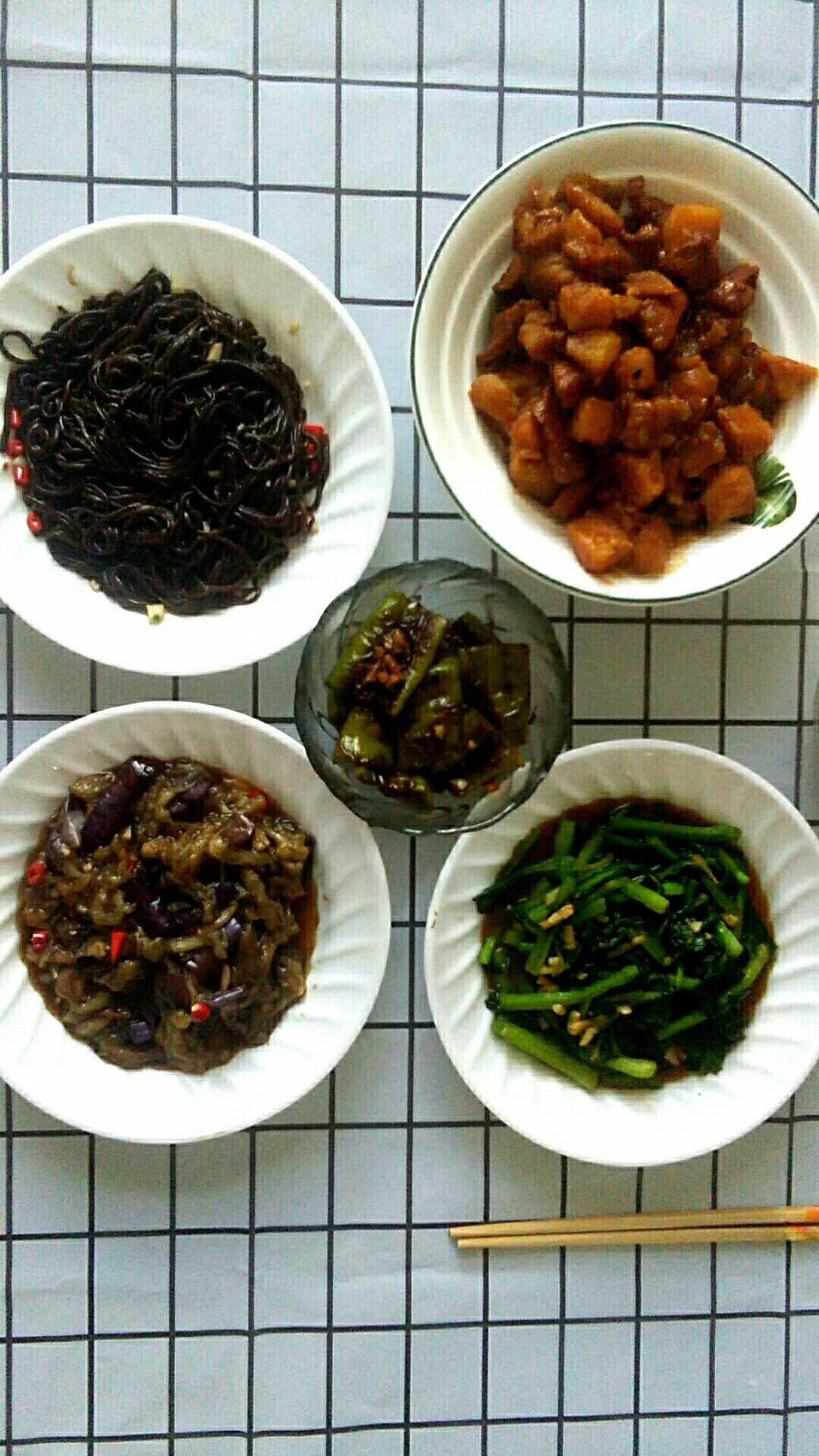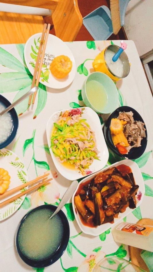 玉米脊骨汤,红烧茄子,西葫芦炒肉