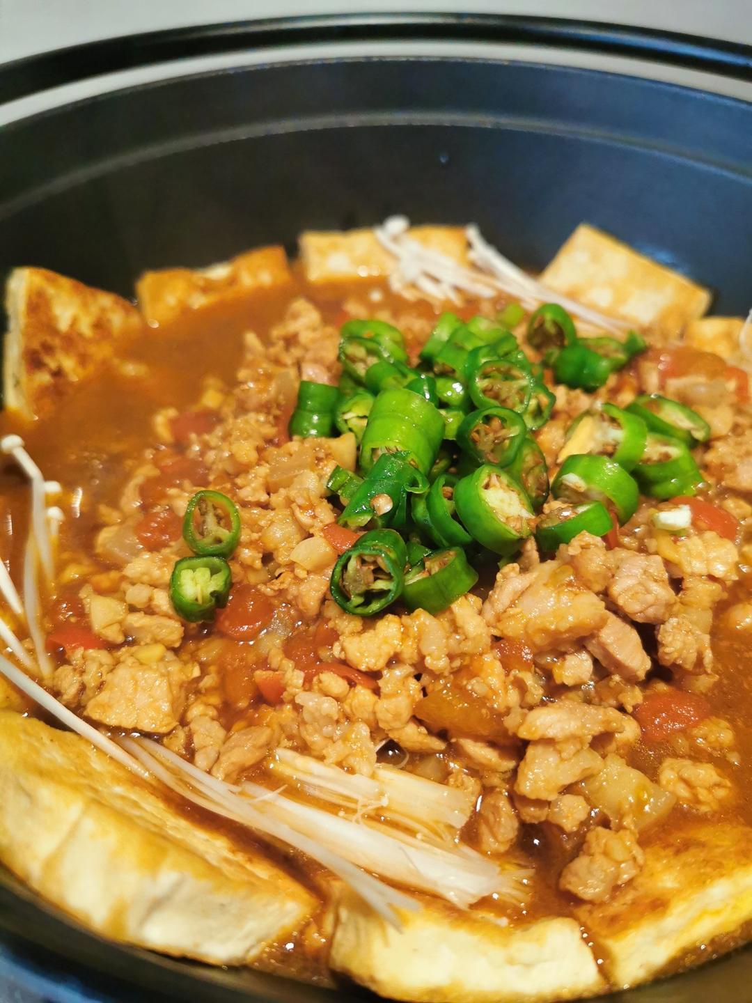 香煎豆腐铺在铸铁汤锅里!