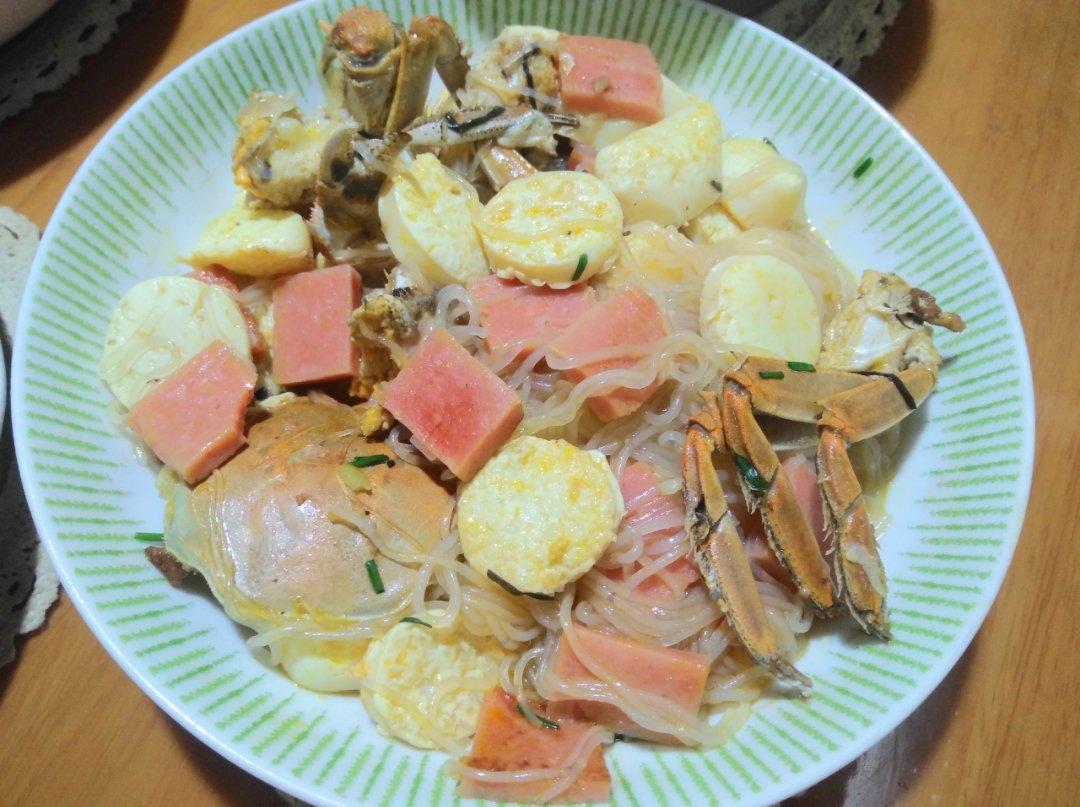 没虾仁放了只螃蟹,加了香肠,味道也不错,汤烧太干了,都被粉丝吸走了,粉丝最好吃!