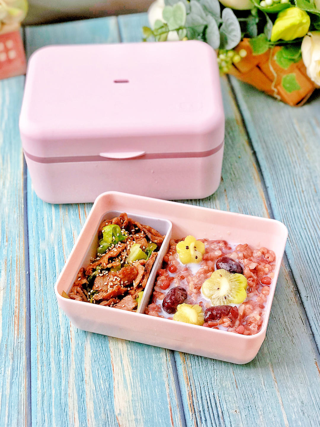 奶香养生粥,牛肉包菜,猕猴桃