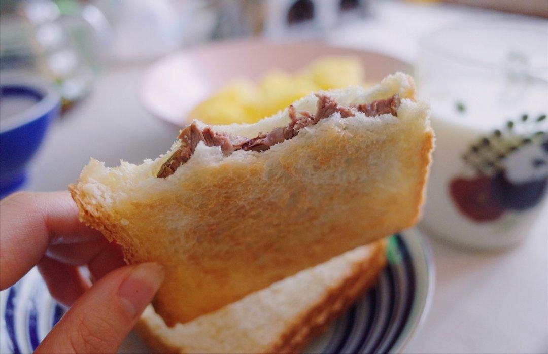吐司面包切厚片,烤一下,中间再切开,夹一片酱牛肉,美味😋