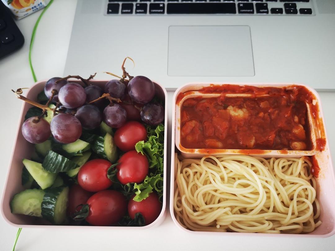 超好吃的意面,意面酱里放了一整袋虾仁。意面饱腹感强,蔬果下午和晚上继续吃