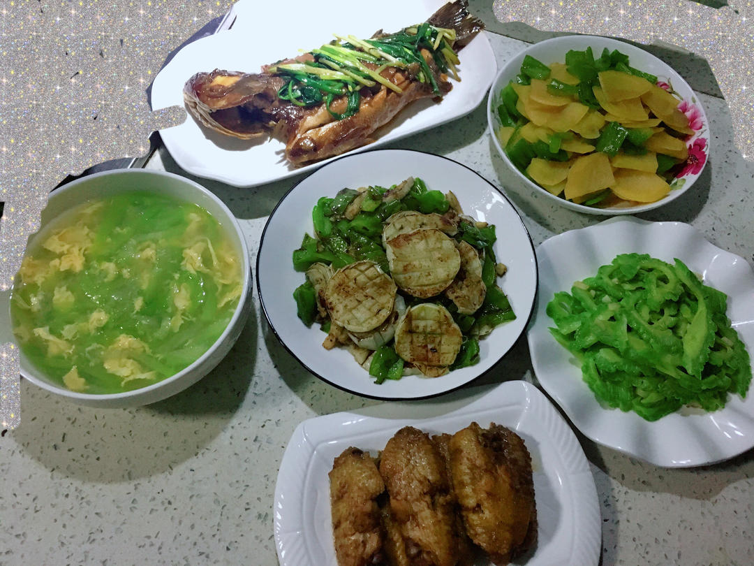 过几天就开学了,孩子们都回来了。红烧鲈鱼,青椒炒土豆片,丝瓜鸡蛋汤,青椒炕白茄子,炒苦瓜,红烧鸡翅