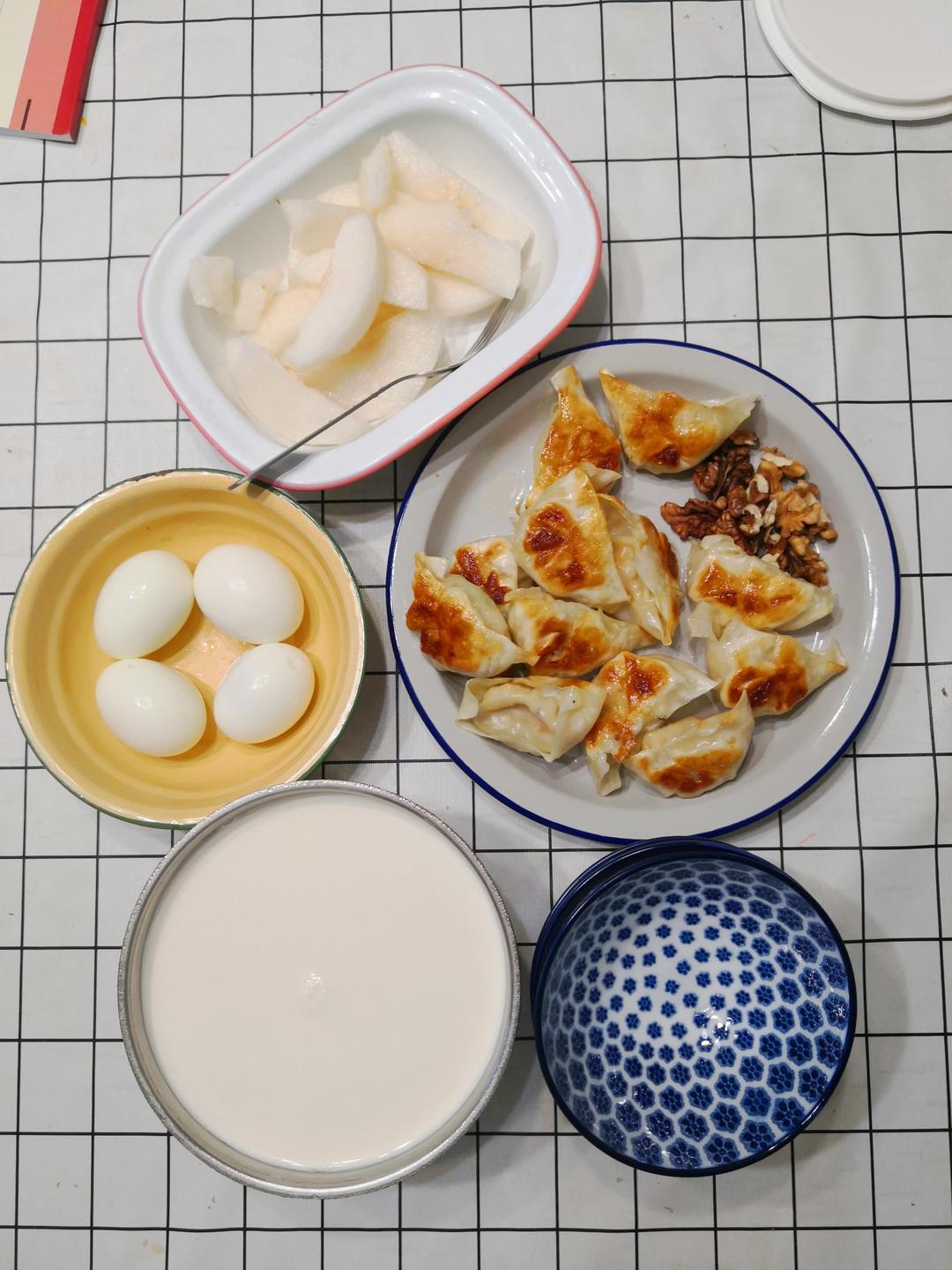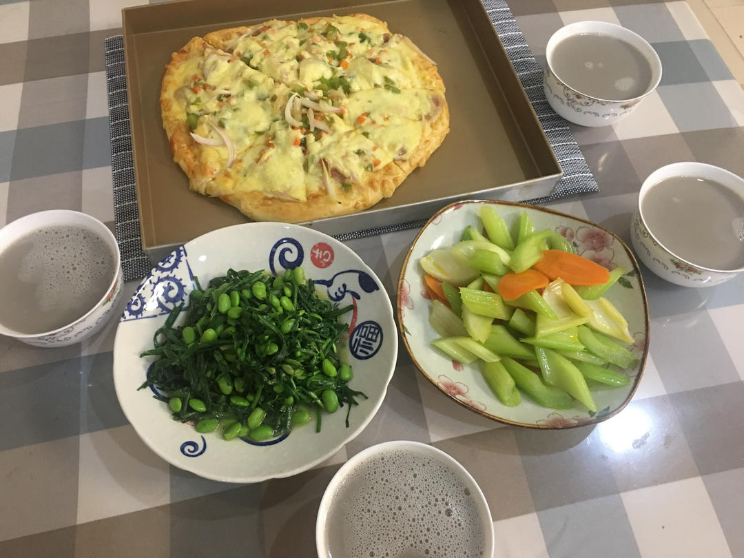 晚饭:自制披萨🍕、毛豆子炒韭菜、西芹胡萝卜、四色豆豆浆✌️