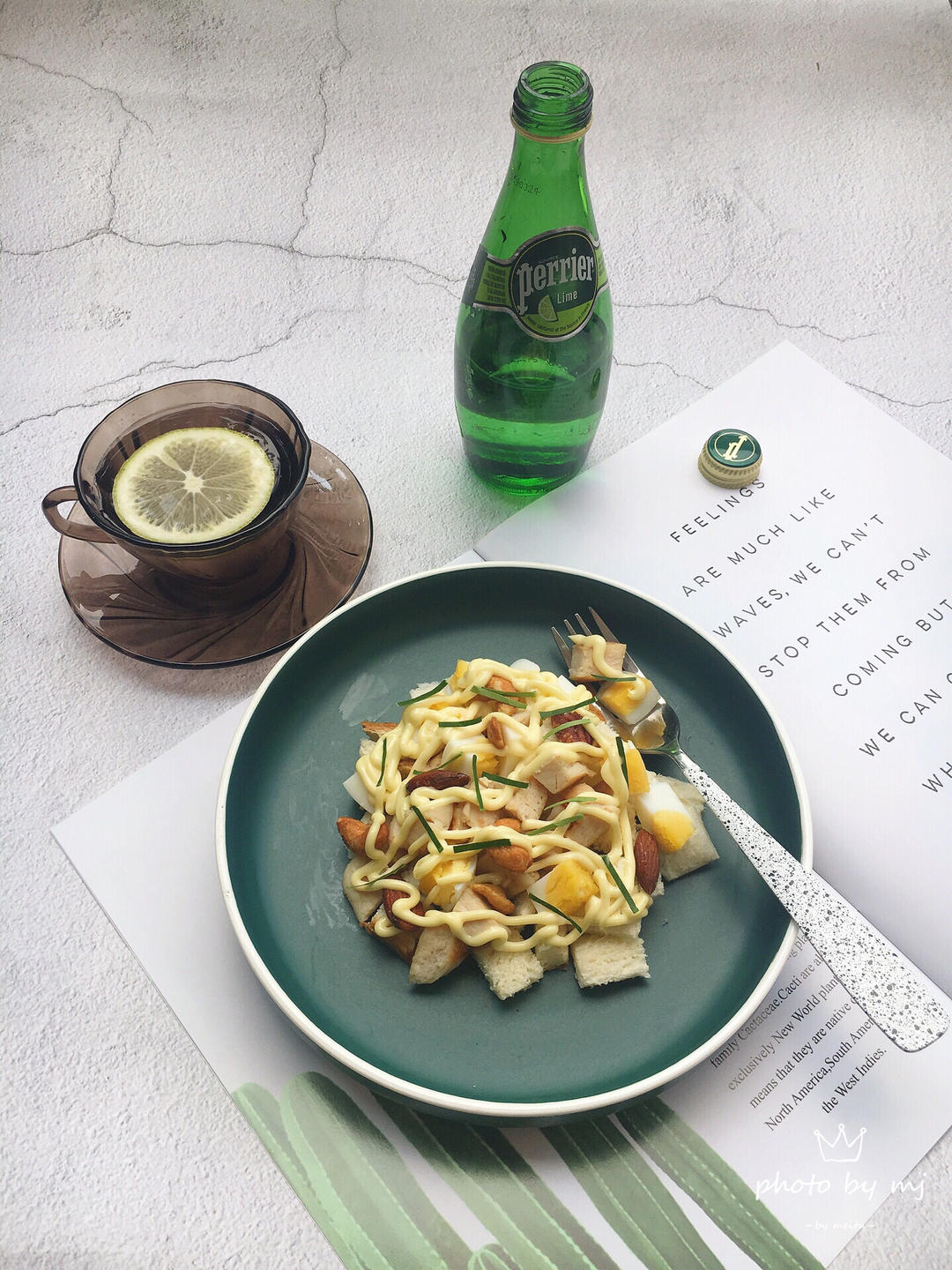 是日早餐:鸡扒面包沙拉,青柠气泡水