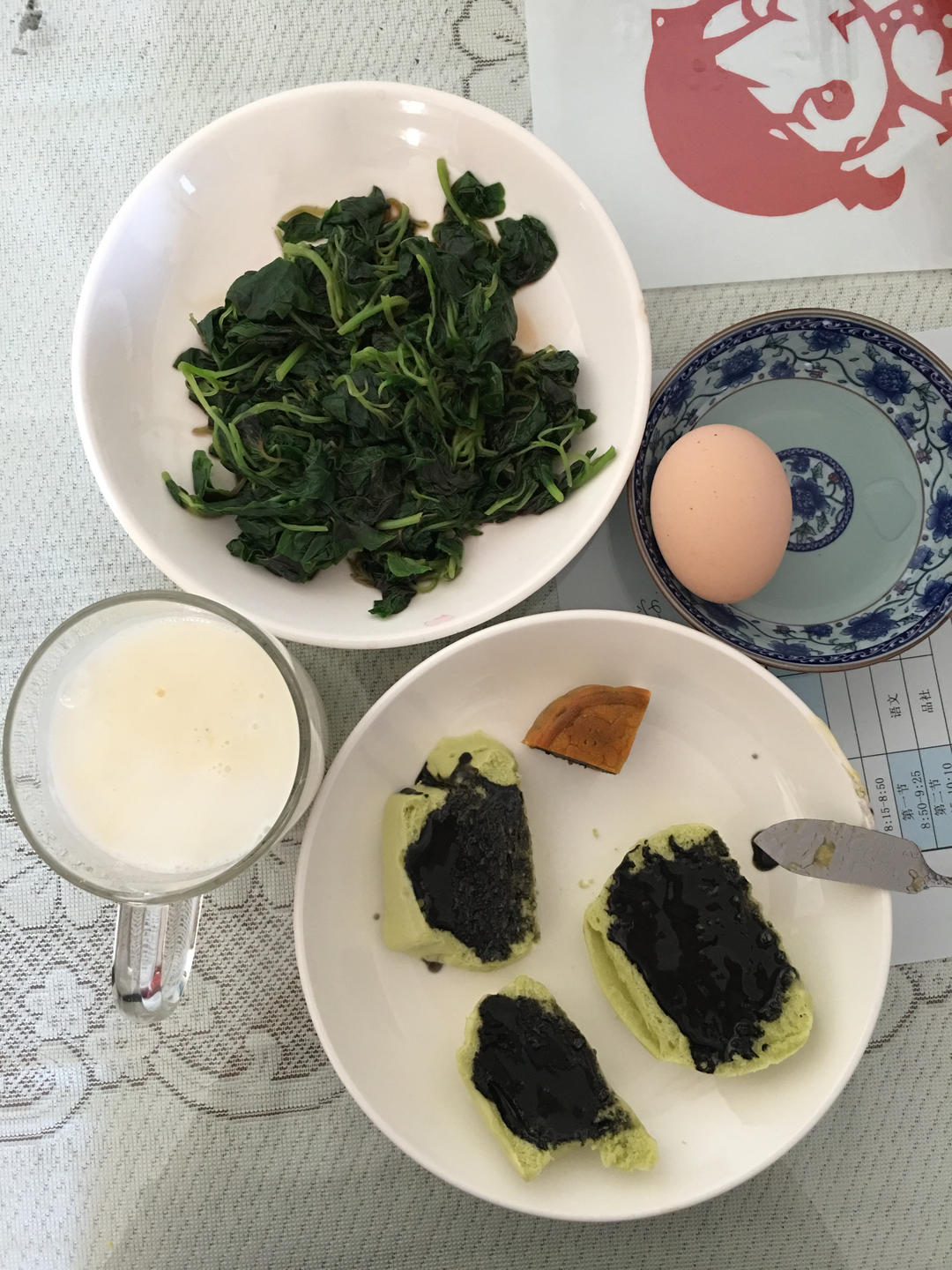 菠菜馒头片涂黑芝麻酱,白煮蛋,烫蔬菜,杏仁糊。今日中秋,美心的陈皮豆沙月饼吃起来。美心的月饼虽然贵,但家里老人喜欢!去年...