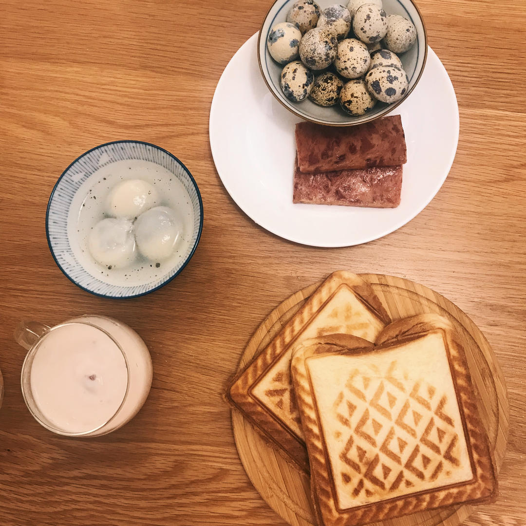 三明治🥪➕午餐肉➕盐焗鹌鹑蛋➕芝麻汤圆➕草莓酸奶
