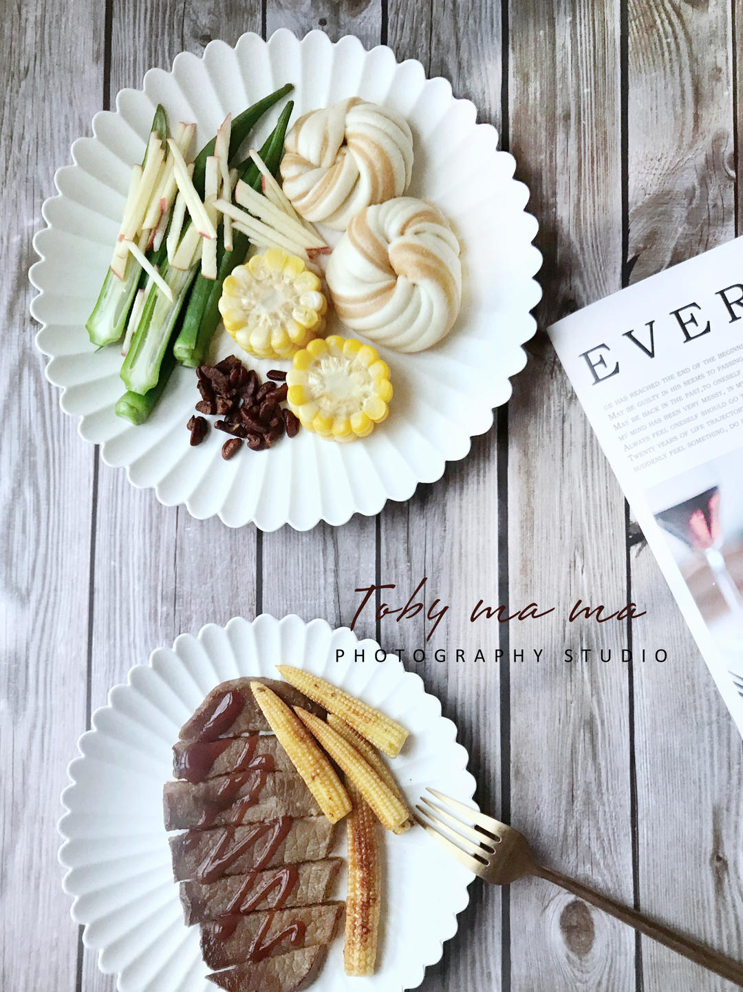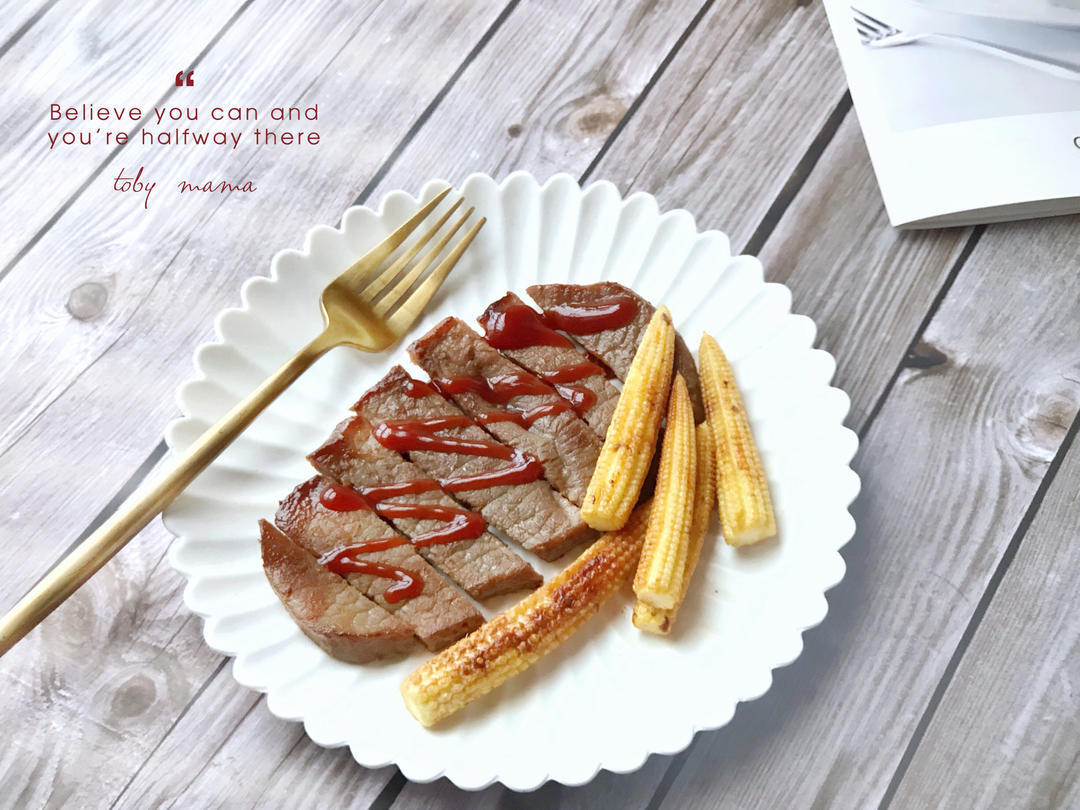 双色花卷 牛排 玉米 蔬菜