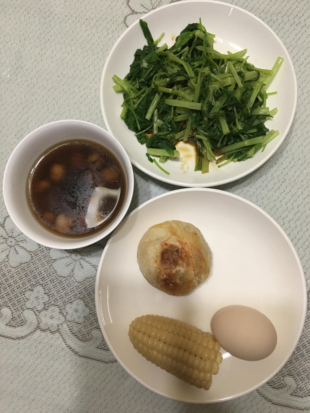 鲜肉月饼,煮玉米,白煮蛋,烫蔬菜,红枣莲子白扁豆花生红豆汤