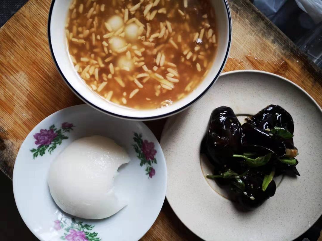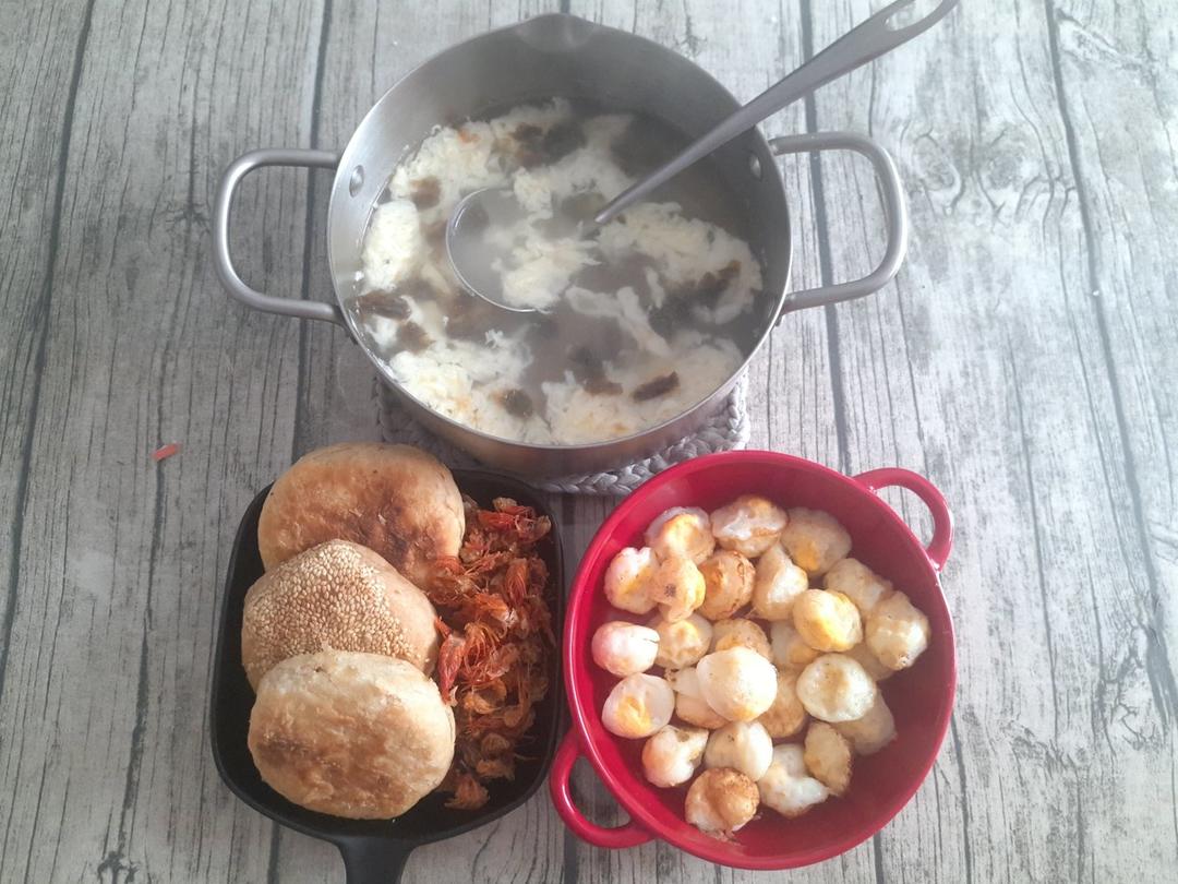 烧饼+炸虾须子+鹌鹑蛋+紫菜蛋花汤,周末早餐三人食!
