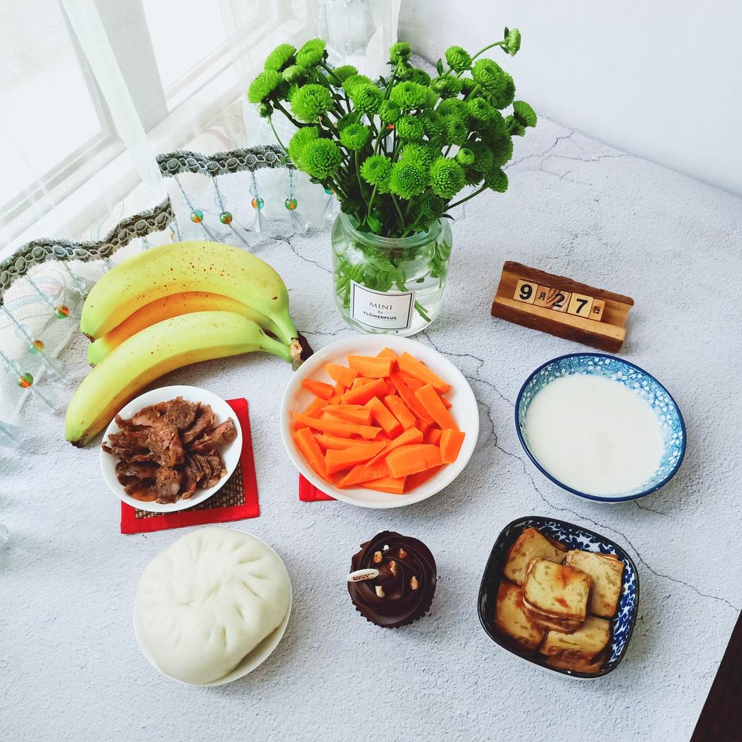 周五早餐:牛奶麦片粥+萝卜粉条素包子+巧克力蛋糕+蒸胡萝卜+千叶豆腐+香肠+香蕉
