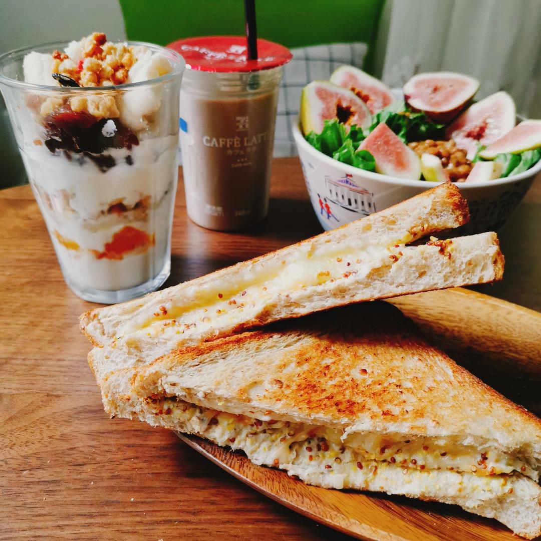 今儿中午依旧吃三明治😋一日本同事给我买了杯711的咖啡,灰常感动😭