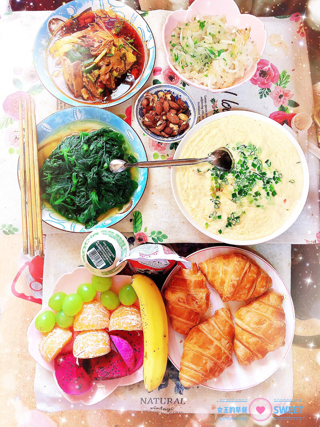 口水鸡,虾仁炖蛋,凉拌海蜇皮萝卜丝,清炒茼蒿,红豆薏仁水,香蕉牛奶,丹麦羊角包,澳洲芦柑,日本青提,火龙果,香蕉,巴旦木...