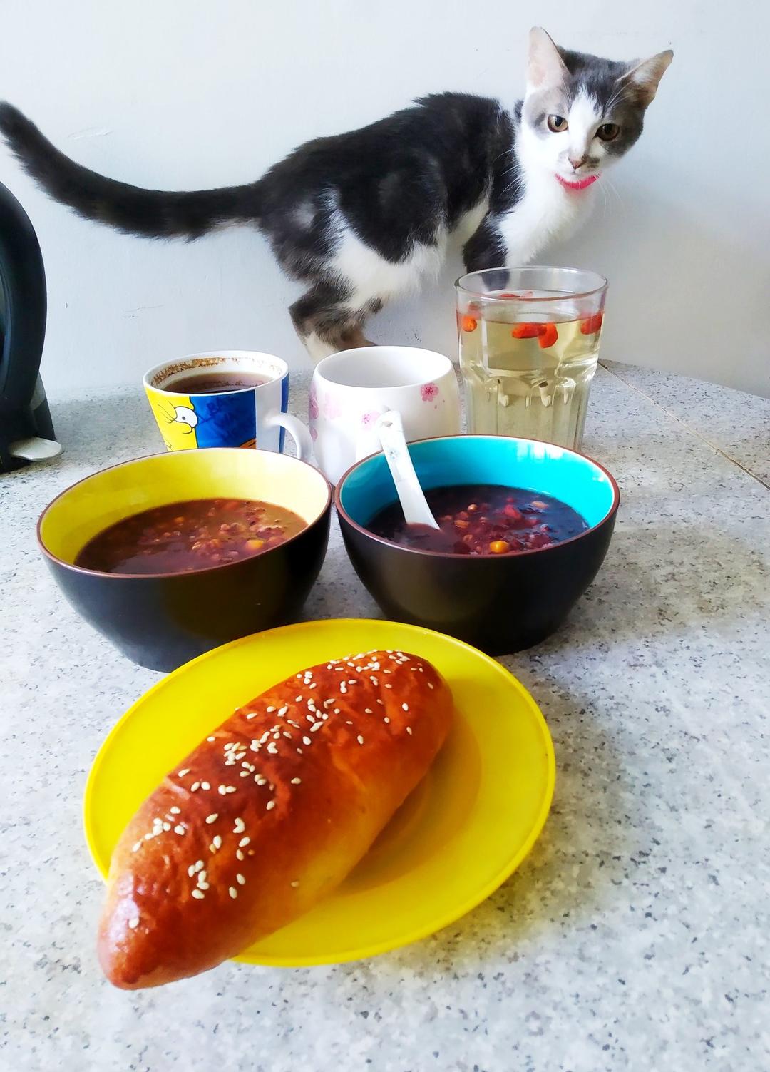 肉松面包超级好吃 特别是面包体 加糖份的部分是银鹭黑米粥 低脂低糖习惯了一吃糖份很奇怪感觉像糖精
