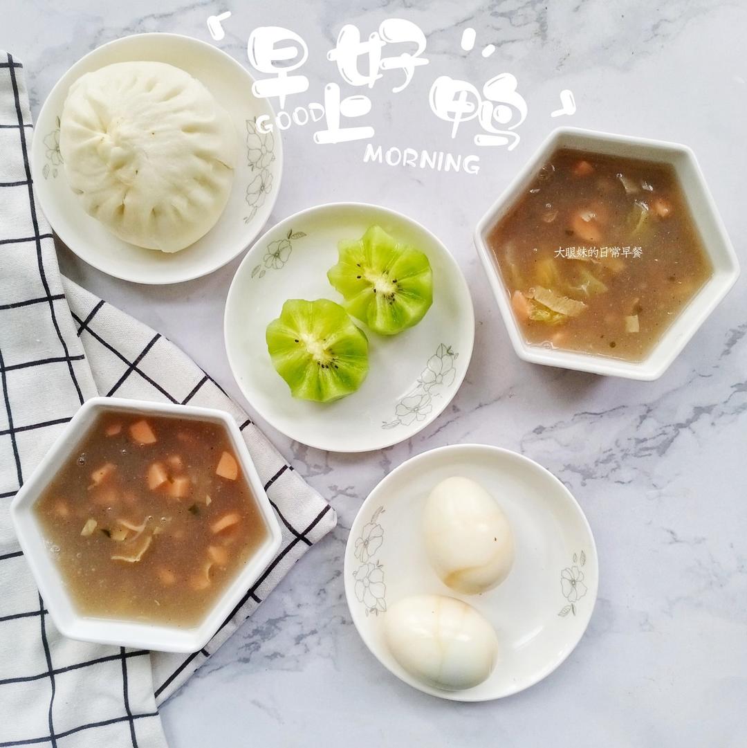 第331day 早餐 自制胡辣汤、叉烧包、卤鸡蛋、猕猴桃