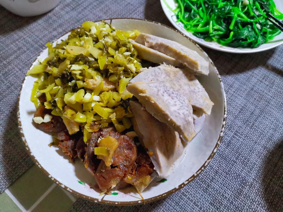 自制酸菜,自制腊肠,蒸芋头